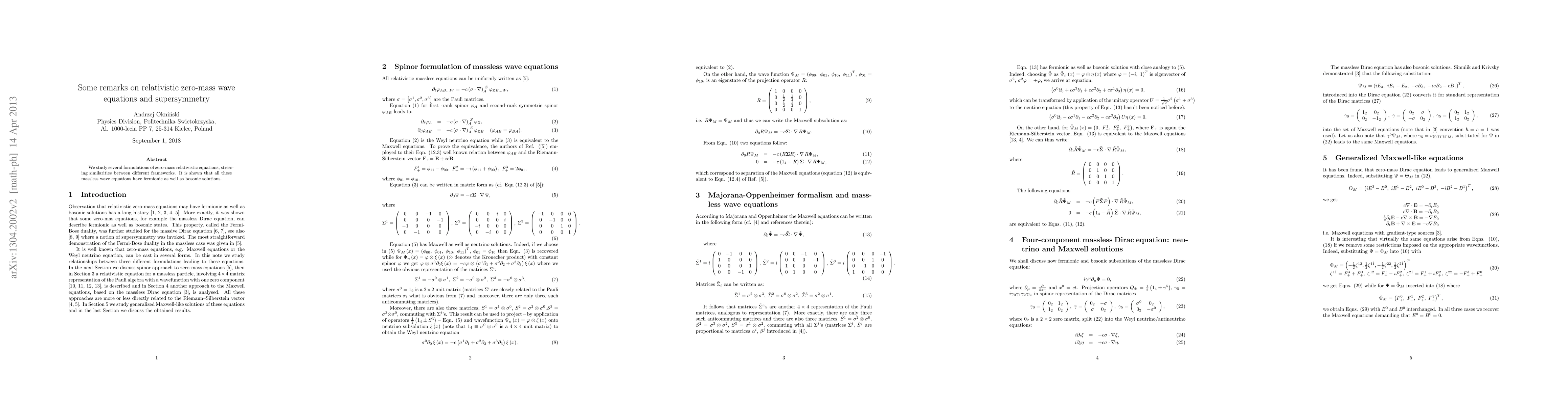 We study several formulations of zero-mass relativistic equations, stressing similarities between different frameworks. It is shown that all these massless wave equations have fermionic as well as bosonic solutions.
