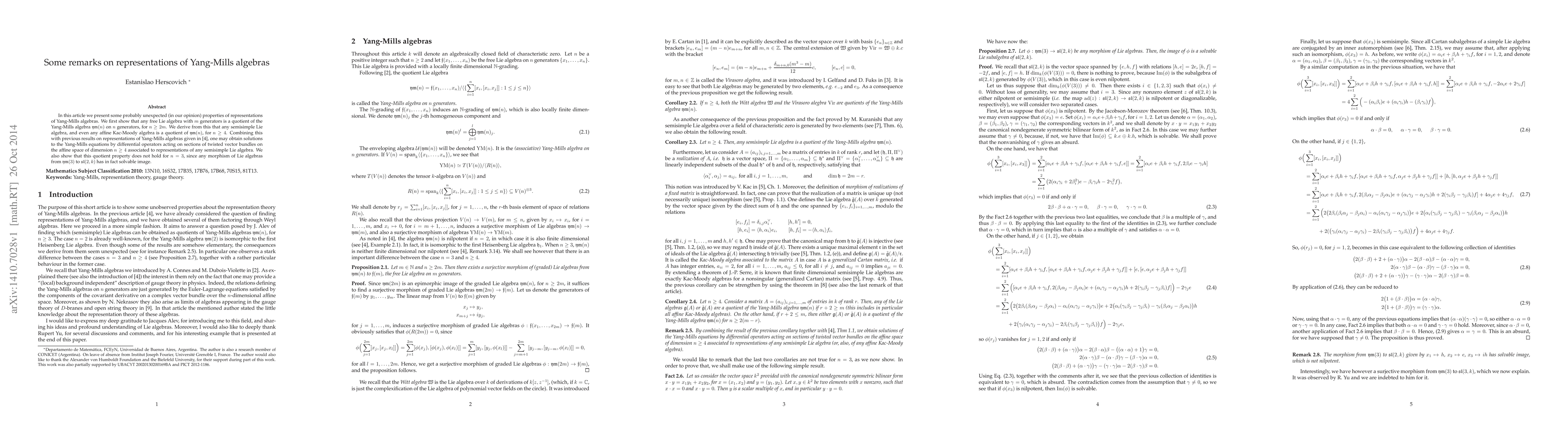 This paper reveals unexpected properties of Yang-Mills algebra representations, showing that any free Lie algebra with m generators is a quotient of ym(n) for n ≥ 2m, and any semisimple Lie algebra is a quotient of ym(n) for n ≥ 4, leading to solutions of Yang-Mills equations via differential operators. However, the quotient property does not hold for n = 3, where morphisms from ym(3) to sl(2,k) have solvable images.