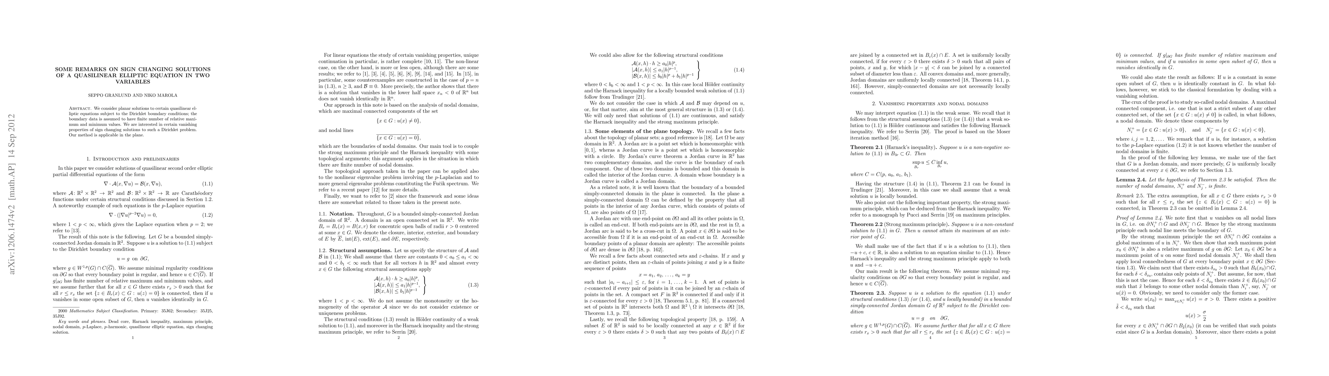 Summary: This paper investigates planar solutions of quasilinear elliptic equations with Dirichlet boundary conditions featuring finite relative extrema. It focuses on the vanishing properties of sign-changing solutions, employing a method applicable in the plane.