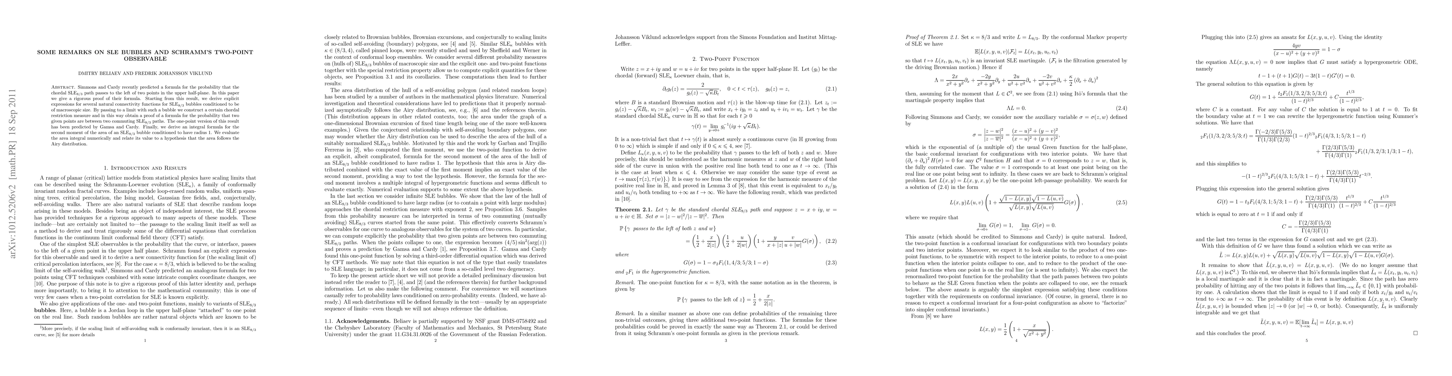 Simmons and Cardy recently predicted a formula for the probability that the chordal SLE(8/3) path passes to the left of two points in the upper half-plane. In this paper we give a rigorous proof of their formula. Starting from this result, we derive explicit expressions for several natural connectivity functions for SLE(8/3) bubbles conditioned to be of macroscopic size. By passing to a limit with such a bubble we construct a certain chordal restriction measure and in this way obtain a proof of a formula for the probability that two given points are between two commuting SLE(8/3) paths. The one-point version of this result has been predicted by Gamsa and Cardy. Finally, we derive an integral formula for the second moment of the area of an SLE(8/3) bubble conditioned to have radius 1. We evaluate the area integral numerically and relate its value to a hypothesis that the area follows the Airy distribution.