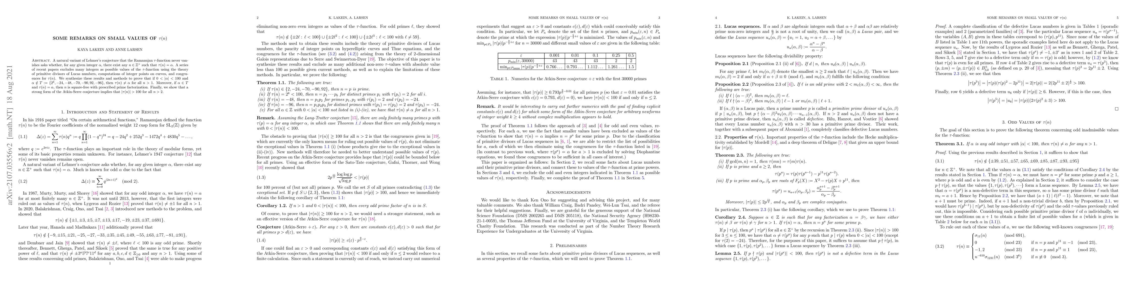 A natural variant of Lehmer's conjecture that the Ramanujan $\tau$-function never vanishes asks whether, for any given integer $\alpha$, there exist any $n \in \mathbb{Z}^+$ such that $\tau(n) = \alpha$. A series of recent papers excludes many integers as possible values of the $\tau$-function using the theory of primitive divisors of Lucas numbers, computations of integer points on curves, and congruences for $\tau(n)$. We synthesize these results and methods to prove that if $0 < |\alpha| < 100$ and $\alpha \notin T := \{2^k, -24,-48, -70,-90, 92, -96\}$, then $\tau(n) \neq \alpha$ for all $n > 1$. Moreover, if $\alpha \in T$ and $\tau(n) = \alpha$, then $n$ is square-free with prescribed prime factorization. Finally, we show that a strong form of the Atkin-Serre conjecture implies that $|\tau(n)| > 100$ for all $n > 2$.