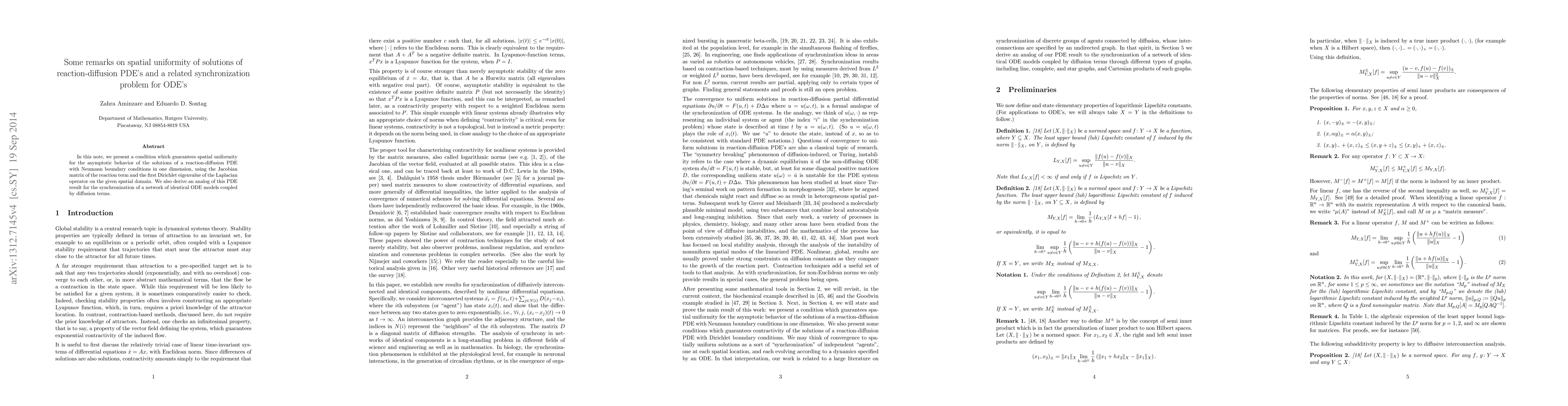 In this note, we present a condition which guarantees spatial uniformity for the asymptotic behavior of the solutions of a reaction-diffusion PDE with Neumann boundary conditions in one dimension, using the Jacobian matrix of the reaction term and the first Dirichlet eigenvalue of the Laplacian operator on the given spatial domain. We also derive an analog of this PDE result for the synchronization of a network of identical ODE models coupled by diffusion terms.