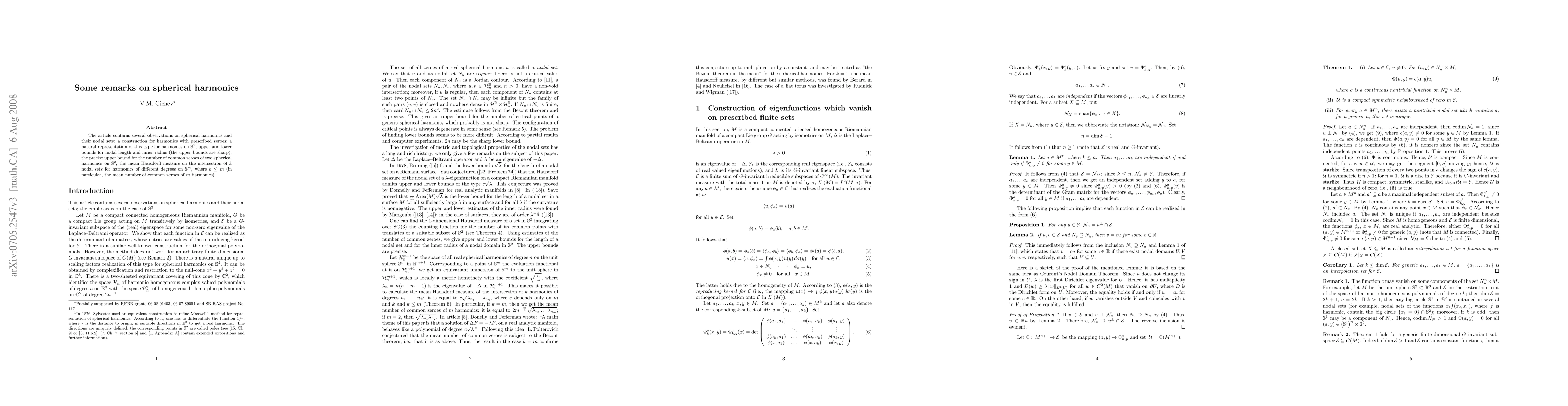 This paper explores various properties of spherical harmonics, including constructions with specified zeroes, canonical representations, bounds on nodal length and inner radius, precise upper bounds on common zeroes, and the mean Hausdorff measure for intersections of nodal sets of harmonics of different degrees.