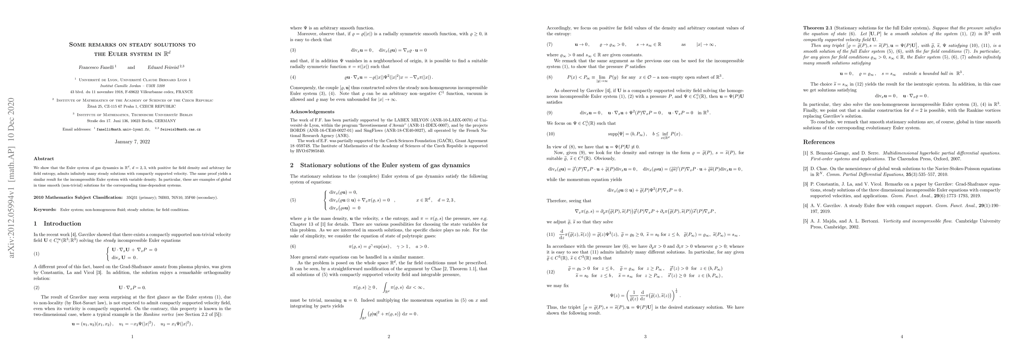 The Euler system of gas dynamics in 2D and 3D space admits infinitely many steady solutions with compactly supported velocity, providing global smooth solutions for the corresponding time-dependent systems.