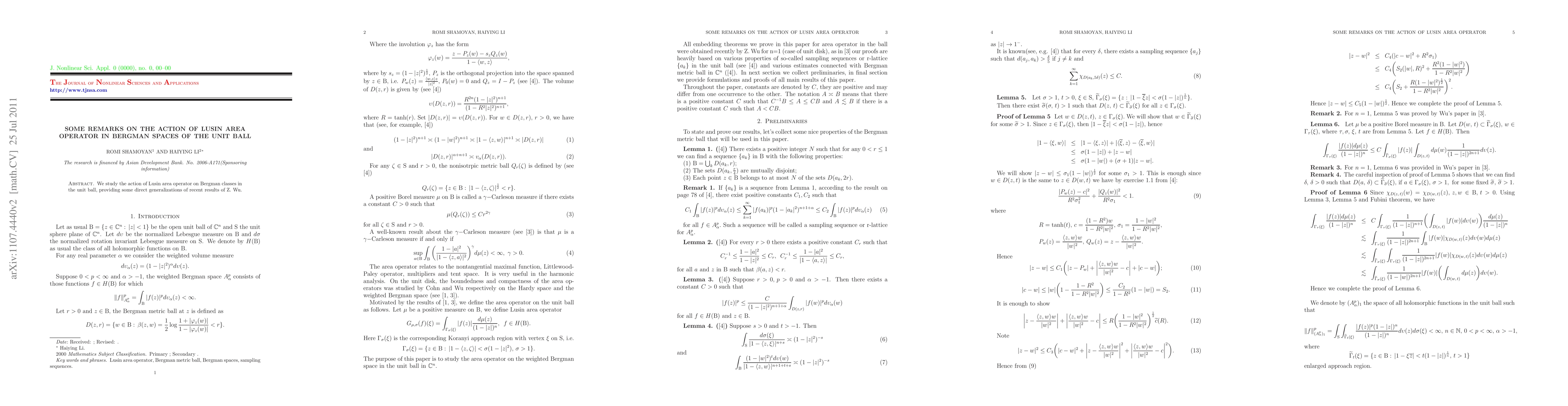 We study the action of Luzin area operator on BErgman classes on the unit ball,providing some direct generalizations of recent results of Z.Wu