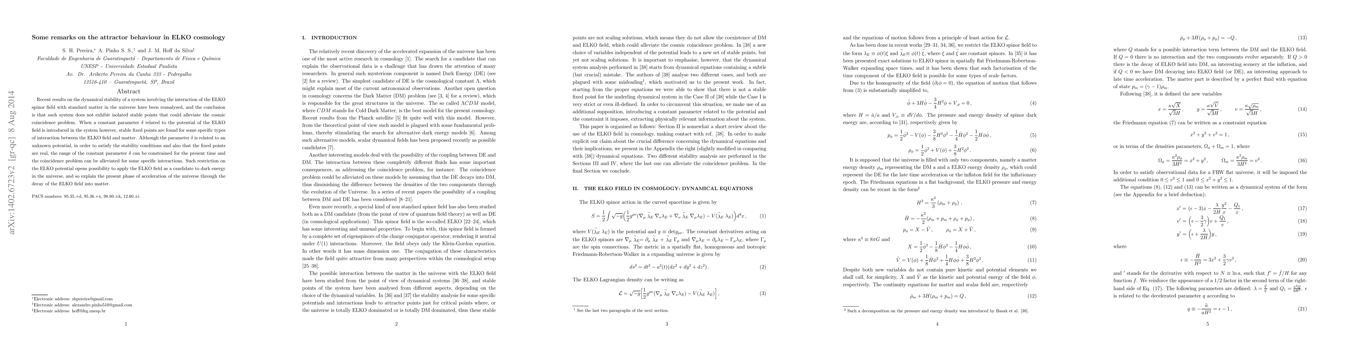 Recent results on the dynamical stability of a system involving the interaction of the ELKO spinor field with standard matter in the universe have been reanalysed, and the conclusion is that such system does not exhibit isolated stable points that could alleviate the cosmic coincidence problem. When a constant parameter $\delta$ related to the potential of the ELKO field is introduced in the system however, stable fixed points are found for some specific types of interaction between the ELKO field and matter. Although the parameter $\delta$ is related to an unknown potential, in order to satisfy the stability conditions and also that the fixed points are real, the range of the constant parameter $\delta$ can be constrained for the present time and the coincidence problem can be alleviated for some specific interactions. Such restriction on the ELKO potential opens possibility to apply the ELKO field as a candidate to dark energy in the universe, and so explain the present phase of acceleration of the universe through the decay of the ELKO field into matter.