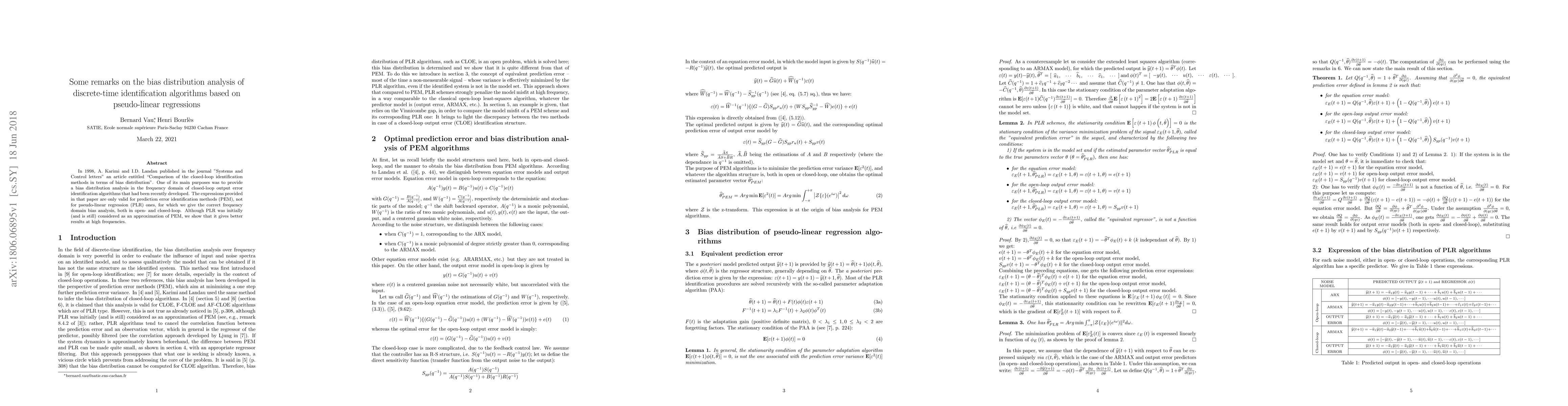 In 1998, A. Karimi and I.D. Landau published in the journal "Systems and Control letters" an article entitled "Comparison of the closed-loop identification methods in terms of bias distribution". One of its main purposes was to provide a bias distribution analysis in the frequency domain of closed-loop output error identification algorithms that had been recently developed. The expressions provided in that paper are only valid for prediction error identification methods (PEM), not for pseudo-linear regression (PLR) ones, for which we give the correct frequency domain bias analysis, both in open- and closed-loop. Although PLR was initially (and is still) considered as an approximation of PEM, we show that it gives better results at high frequencies.