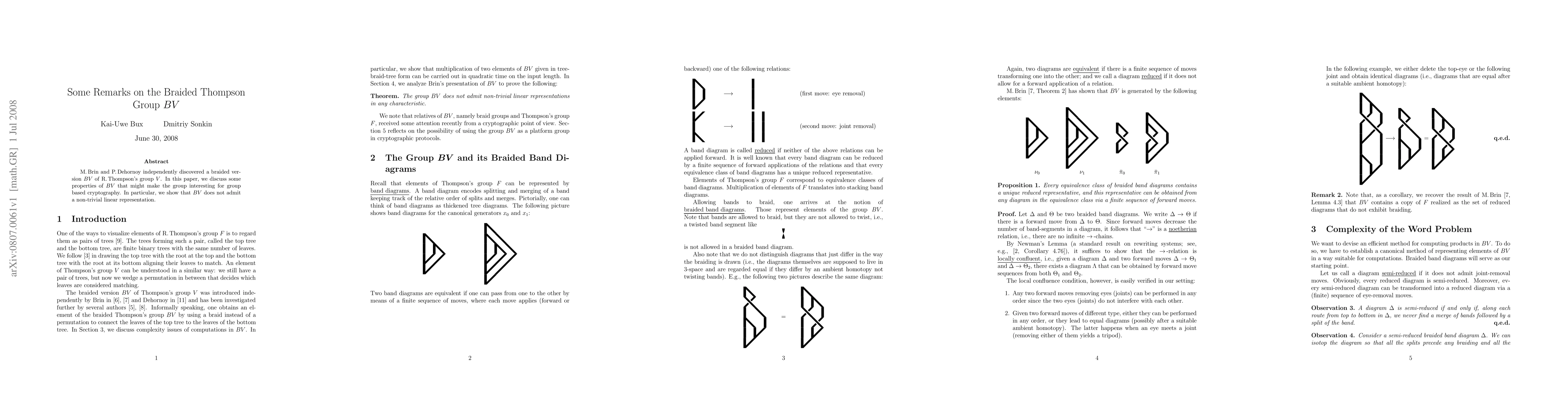 Title: Some Remarks on the Braided Thompson Group BV Summary: This paper explores properties of the braided Thompson group BV, suggesting its potential for group-based cryptography; it specifically demonstrates that BV lacks non-trivial linear representations.