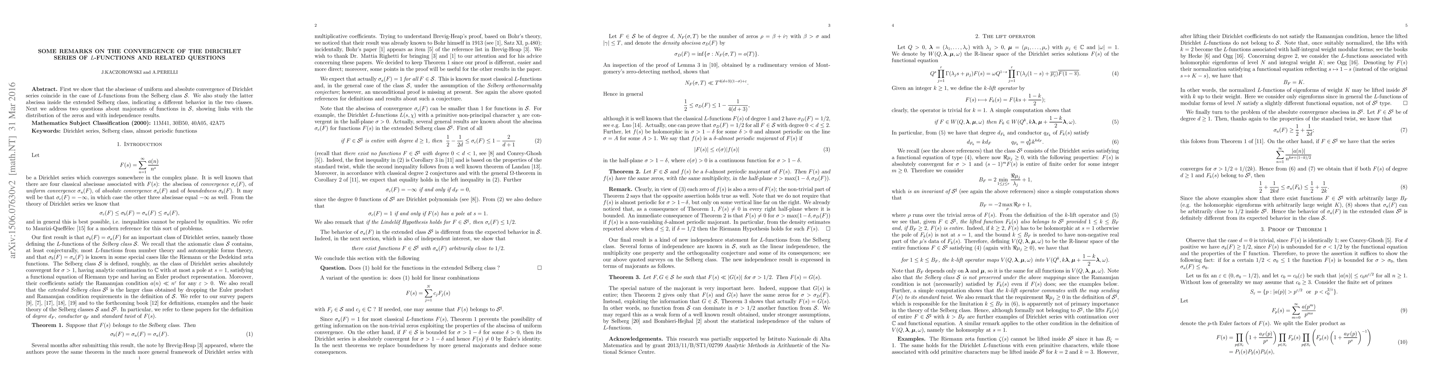 First we show that the abscissae of uniform and absolute convergence of Dirichlet series coincide in the case of $L$-functions from the Selberg class $\mathcal{S}$. We also study the latter abscissa inside the extended Selberg class, indicating a different behavior in the two classes. Next we address two questions about majorants of functions in $\mathcal{S}$, showing links with the distribution of the zeros and with independence results.
