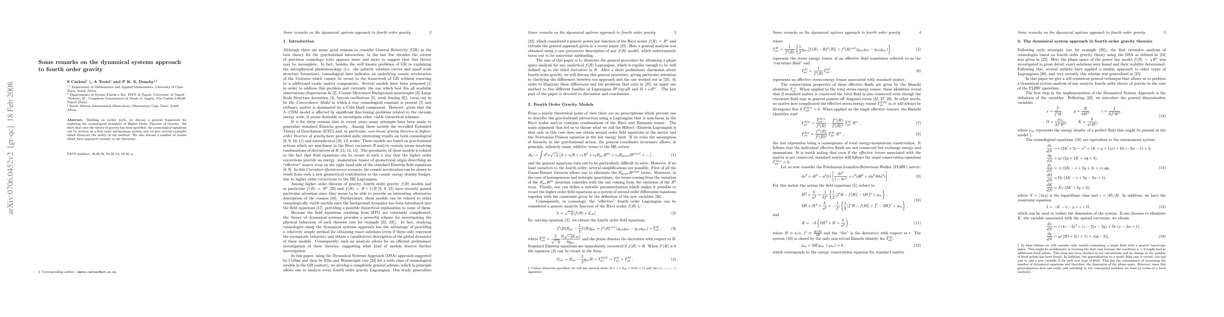 Building on earlier work, we discuss a general framework for exploring the cosmological dynamics of Higher Order Theories of Gravity. We show that once the theory of gravity has been specified, the cosmological equations can be written as a first-order autonomous system and we give several examples which illustrate the utility of our method. We also discuss a number of results which have appeared recently in the literature.