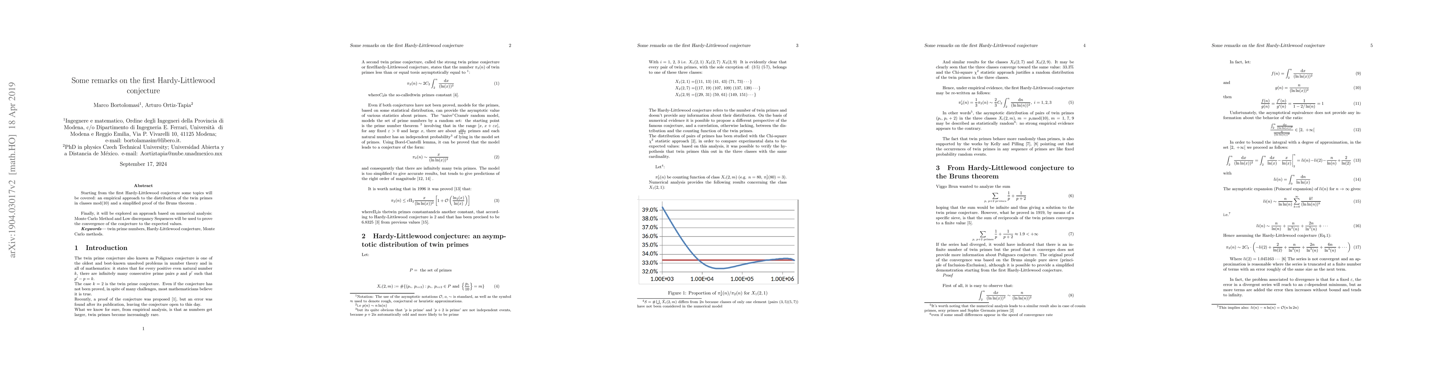 Summary: The paper explores the first Hardy-Littlewood conjecture through an empirical investigation of twin prime distribution in classes mod(10), a simplified proof of Brun's theorem, and a numerical analysis approach using Monte Carlo and low discrepancy sequences to demonstrate the conjecture's convergence to expected values.