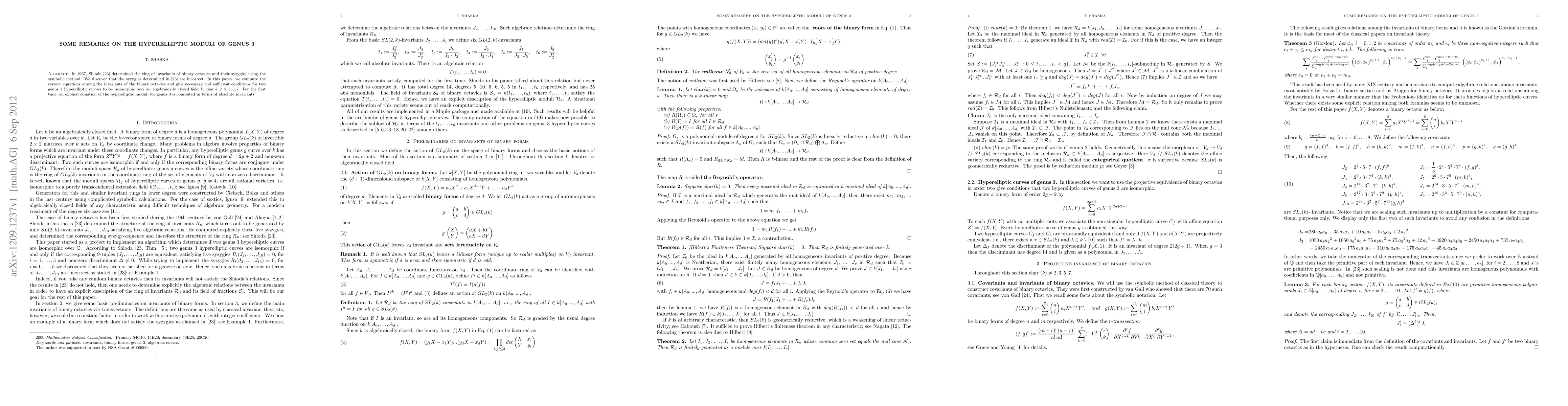 In 1967, Shioda \cite{Shi1} determined the ring of invariants of binary octavics and their syzygies using the symbolic method. We discover that the syzygies determined in \cite{Shi1} are incorrect. In this paper, we compute the correct equations among the invariants of the binary octavics and give necessary and sufficient conditions for two genus 3 hyperelliptic curves to be isomorphic over an algebraically closed field $k$, $\ch k \neq 2, 3, 5, 7$. For the first time, an explicit equation of the hyperelliptic moduli for genus 3 is computed in terms of absolute invariants.