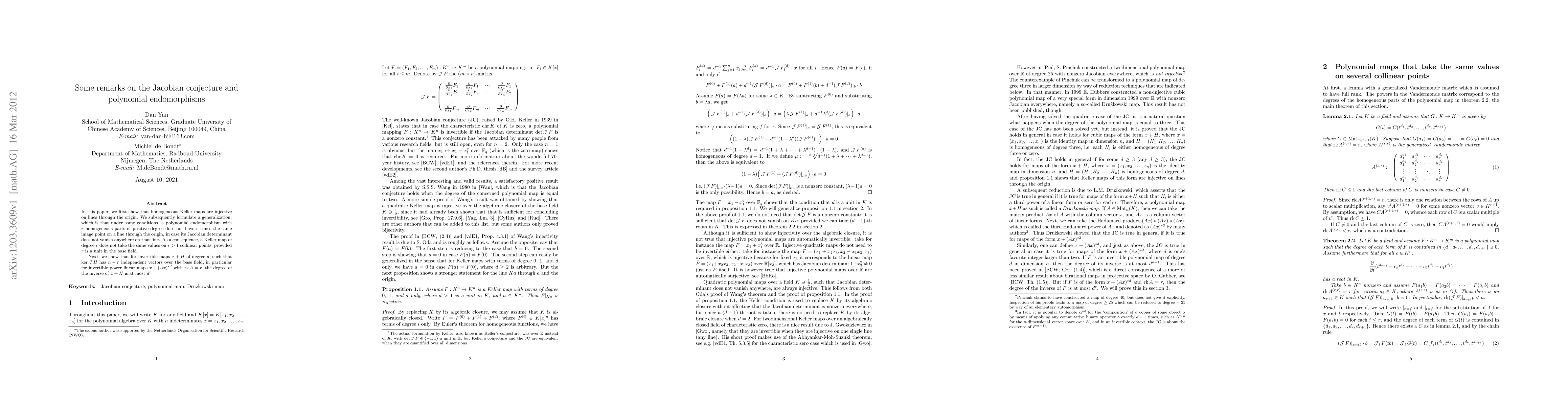 In this paper, we first show that homogeneous Keller maps are injective on lines through the origin. We subsequently formulate a generalization, which is that under some conditions, a polynomial endomorphism with $r$ homogeneous parts of positive degree does not have $r$ times the same image point on a line through the origin, in case its Jacobian determinant does not vanish anywhere on that line. As a consequence, a Keller map of degree $r$ does not take the same values on $r > 1$ collinear points, provided $r$ is a unit in the base field. Next, we show that for invertible maps $x + H$ of degree $d$, such that $\ker \jac H$ has $n-r$ independent vectors over the base field, in particular for invertible power linear maps $x + (Ax)^{*d}$ with $\rk A = r$, the degree of the inverse of $x + H$ is at most $d^r$.