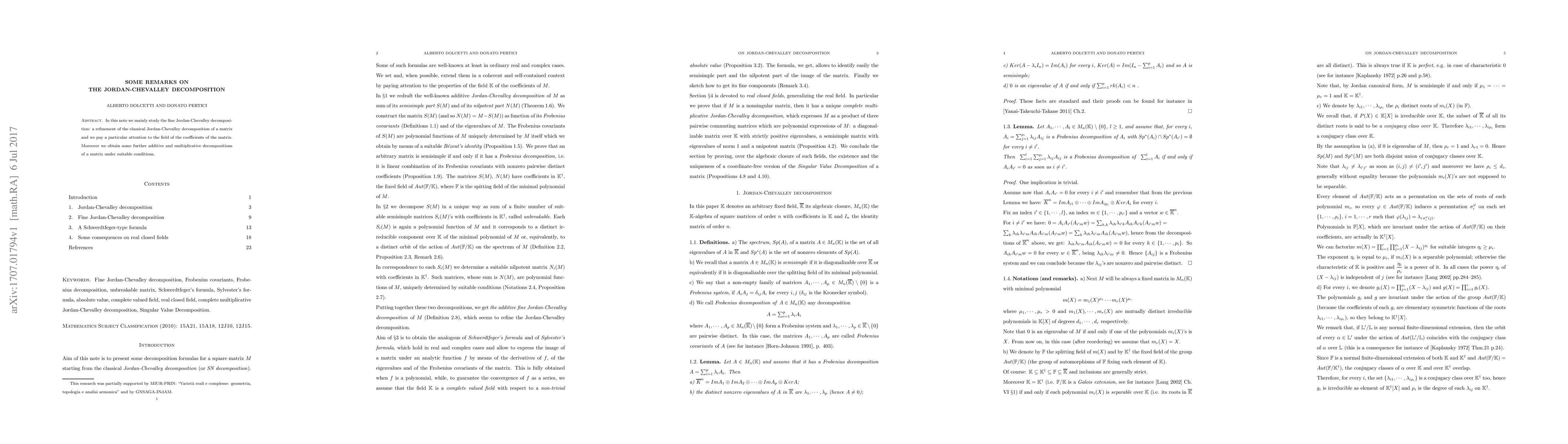 This paper explores the fine Jordan-Chevalley decomposition, refining the classical version and emphasizing the field of coefficients. It also presents additional additive and multiplicative decompositions of matrices under certain conditions.