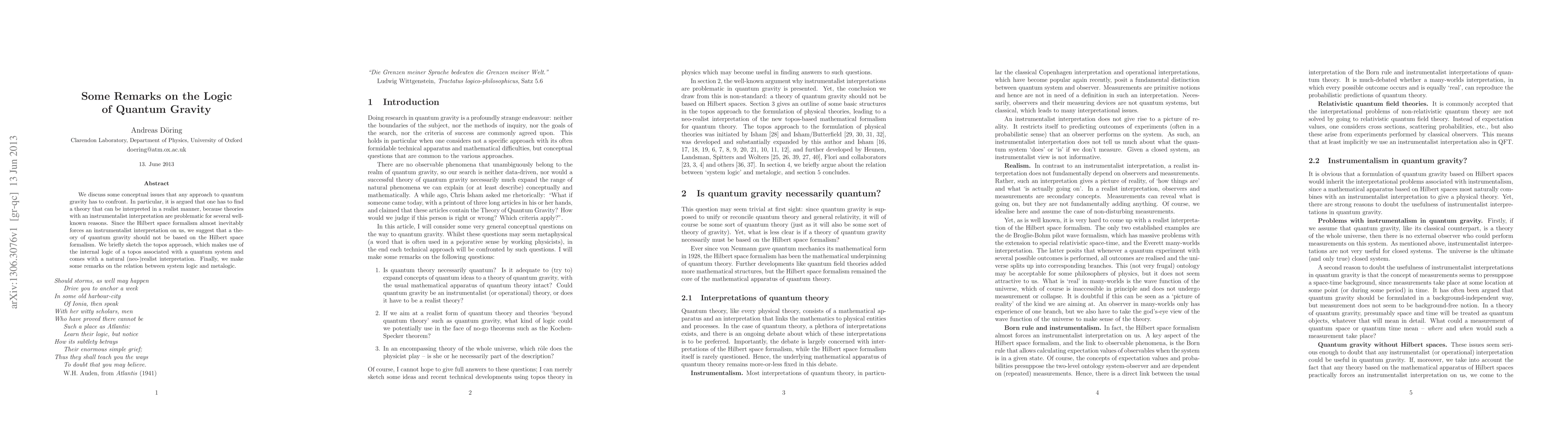 We discuss some conceptual issues that any approach to quantum gravity has to confront. In particular, it is argued that one has to find a theory that can be interpreted in a realist manner, because theories with an instrumentalist interpretation are problematic for several well-known reasons. Since the Hilbert space formalism almost inevitably forces an instrumentalist interpretation on us, we suggest that a theory of quantum gravity should not be based on the Hilbert space formalism. We briefly sketch the topos approach, which makes use of the internal logic of a topos associated with a quantum system and comes with a natural (neo-)realist interpretation. Finally, we make some remarks on the relation between system logic and metalogic.
