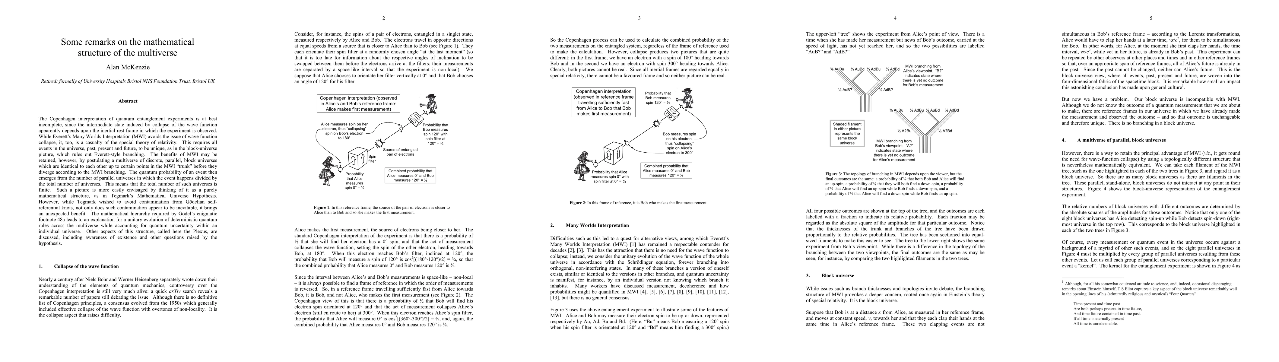 The Copenhagen interpretation of quantum entanglement experiments is at best incomplete, since the intermediate state induced by collapse of the wave function apparently depends upon the inertial rest frame in which the experiment is observed. While the Many Worlds Interpretation of Everett, MWI, avoids the issue of wave function collapse, it, too, is a casualty of the special theory of relativity. This requires all events in the universe, past, present and future, to be unique, as in the block universe picture, which rules out Everett style branching. The benefits of MWI may be retained, however, by postulating a multiverse of discrete, parallel, block universes which are identical to each other up to certain points in the MWI trunk before they diverge according to the MWI branching. The quantum probability of an event then emerges from the number of parallel universes in which the event happens divided by the total number of universes. This means that the total number of such universes is finite. Such a picture is more easily envisaged by thinking of it as a purely mathematical structure, as in the Mathematical Universe Hypothesis proposed by Tegmark. However, while Tegmark wished to avoid contamination from Goedelian self referential knots, not only does such contamination appear to be inevitable, it brings an unexpected benefit. The mathematical hierarchy required by the enigmatic footnote 48a in the paper by Goedel leads to an explanation for a unitary evolution of deterministic quantum rules across the multiverse while accounting for quantum uncertainty within an individual universe. Other aspects of this structure, called here the Plexus, are discussed, including awareness of existence and other questions raised by the hypothesis.