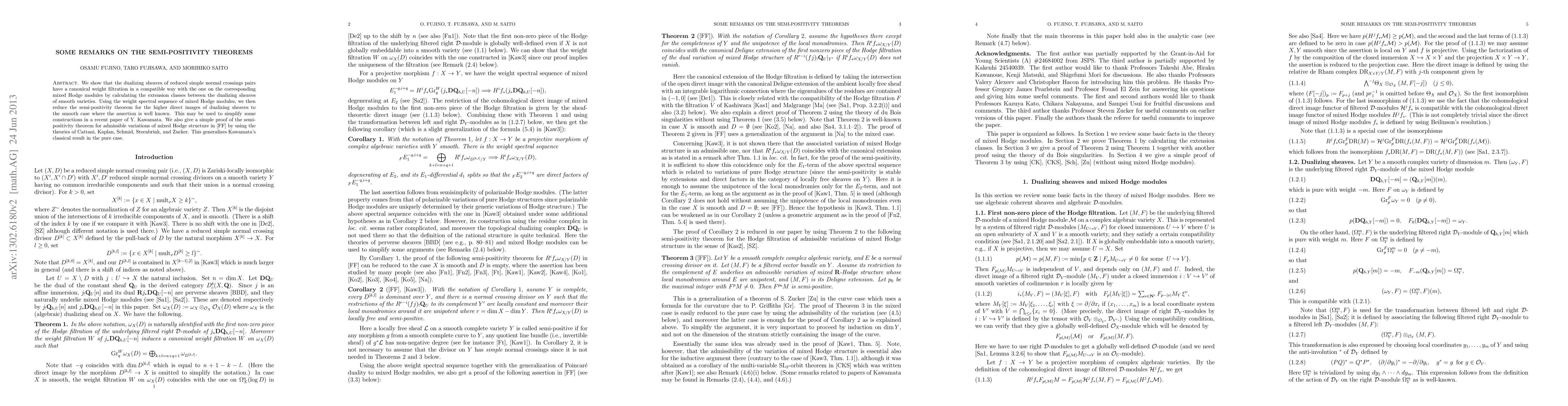 We show that the dualizing sheaves of reduced simple normal crossings pairs have a canonical weight filtration in a compatible way with the one on the corresponding mixed Hodge modules by calculating the extension classes between the dualizing sheaves of smooth varieties. Using the weight spectral sequence of mixed Hodge modules, we then reduce the semi-positivity theorem for the higher direct images of dualizing sheaves to the smooth case where the assertion is well known. This may be used to simplify some constructions in a recent paper of Y. Kawamata. We also give a simple proof of the semi-positivity theorem for admissible variations of mixed Hodge structure in [FF] by using the theories of Cattani, Kaplan, Schmid, Steenbrink, and Zucker. This generalizes Kawamata's classical result in the pure case.