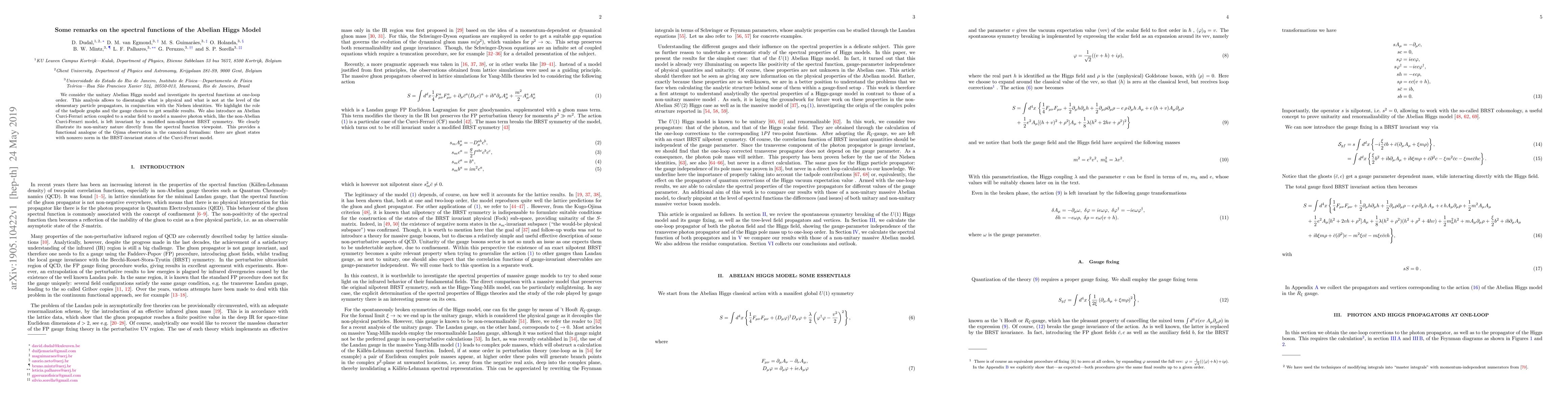 We consider the unitary Abelian Higgs model and investigate its spectral functions at one-loop order. This analysis allows to disentangle what is physical and what is not at the level of the elementary particle propagators, in conjunction with the Nielsen identities. We highlight the role of the tadpole graphs and the gauge choices to get sensible results. We also introduce an Abelian Curci-Ferrari action coupled to a scalar field to model a massive photon which, like the non-Abelian Curci-Ferarri model, is left invariant by a modified non-nilpotent BRST symmetry. We clearly illustrate its non-unitary nature directly from the spectral function viewpoint. This provides a functional analogue of the Ojima observation in the canonical formalism: there are ghost states with nonzero norm in the BRST-invariant states of the Curci-Ferrari model.