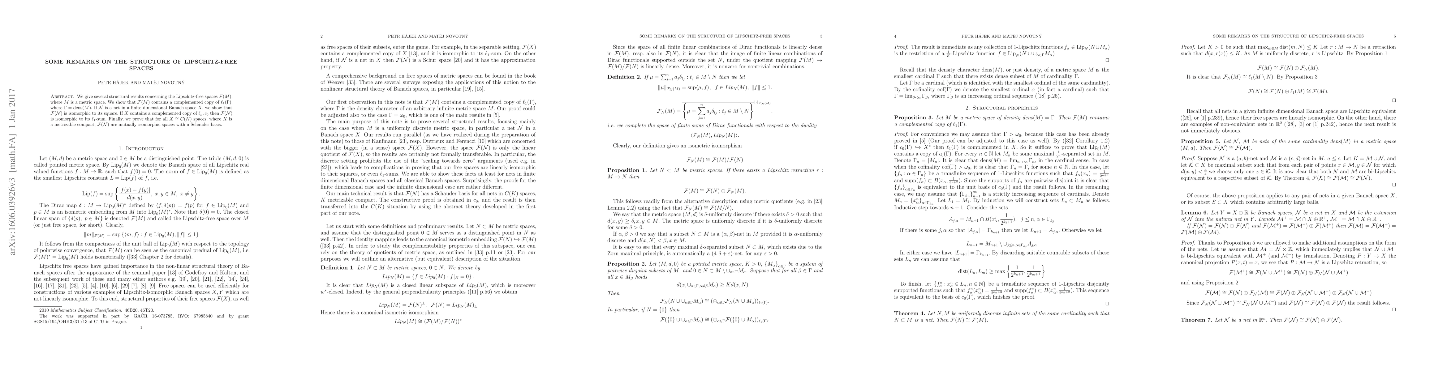 We give several structural results concerning the Lipschitz-free spaces $\mathcal F(M)$, where $M$ is a metric space. We show that $\mathcal F(M)$ contains a complemented copy of $\ell_1(\Gamma)$, where $\Gamma=\text{dens}(M)$. If $\mathcal N$ is the net in a finite dimensional Banach space $X$, we show that $\mathcal F(\mathcal N)$ is isomorphic to its square. If $X$ contains a complemented copy of $\ell_p, c_0$ then $\mathcal F(\mathcal N)$ is isomorphic to its $\ell_1$-sum. Finally, we prove that for all $X\cong C(K)$ spaces $\mathcal F(\mathcal N)$ are mutually isomorphic spaces with a Schauder basis.