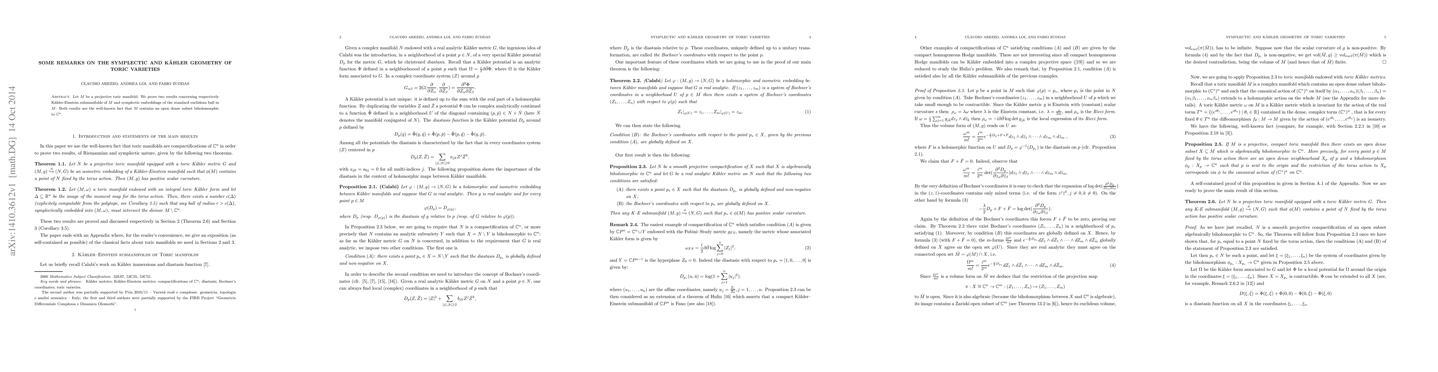 Let $M$ be a projective toric manifold. We prove two results concerning respectively Kaehler-Einstein submanifolds of M and symplectic embeddings of the standard euclidean ball in M. Both results use the well-known fact that M contains an open dense subset biholomorphic to C^n.