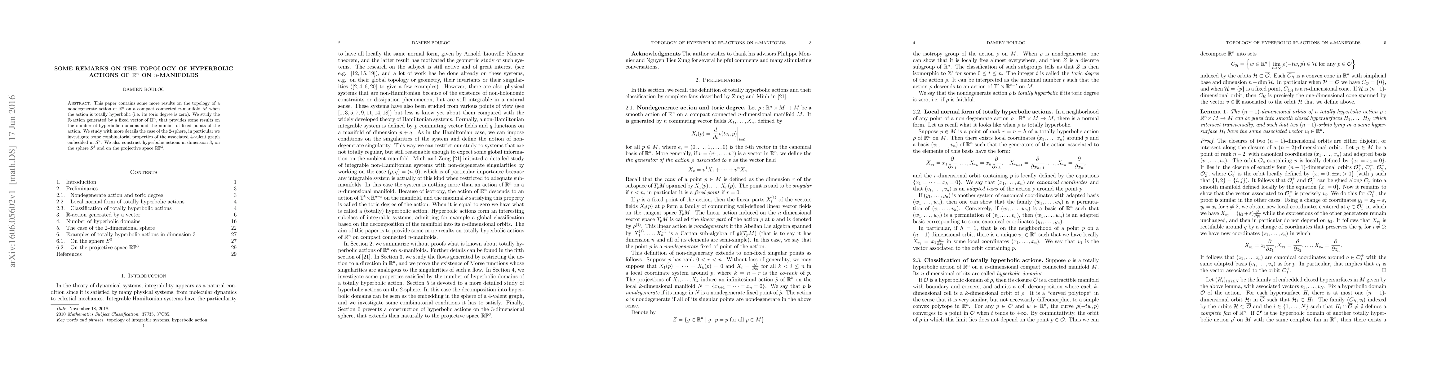 This paper contains some more results on the topology of a nondegenerate action of $\mathbb{R}^n$ on a compact connected $n$-manifold $M$ when the action is totally hyperbolic (i.e. its toric degree is zero). We study the $\mathbb{R}$-action generated by a fixed vector of $\mathbb{R}^n$, that provides some results on the number of hyperbolic domains and the number of fixed points of the action. We study with more details the case of the 2-sphere, in particular we investigate some combinatorial properties of the associated 4-valent graph embedded in $S^2$. We also construct hyperbolic actions in dimension 3, on the sphere $S^3$ and on the projective space $\mathbb{RP}^3$.