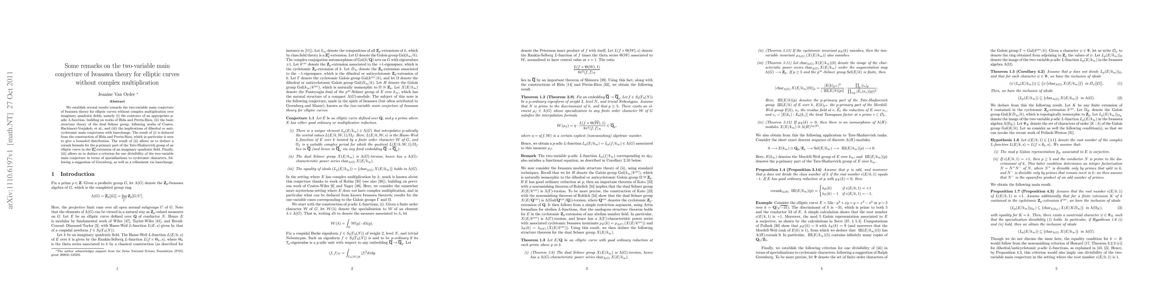 We establish several results towards the two-variable main conjecture of Iwasawa theory for elliptic curves without complex multiplication over imaginary quadratic fields, namely (i) the existence of an appropriate p-adic L-function, building on works of Hida and Perrin-Riou, (ii) the basic structure theory of the dual Selmer group, following works of Coates, Hachimori-Venjakob, et al., and (iii) the implications of dihedral or anticyclotomic main conjectures with basechange. The result of (i) is deduced from the construction of Hida and Perrin-Riou, which in particular is seen to give a bounded distribution. The result of (ii) allows us to deduce a corank formula for the p-primary part of the Tate-Shafarevich group of an elliptic curve in the Z_p^2-extension of an imaginary quadratic field. Finally, (iii) allows us to deduce a criterion for one divisibility of the two-variable main conjecture in terms of specializations to cyclotomic characters, following a suggestion of Greenberg, as well as a refinement via basechange.