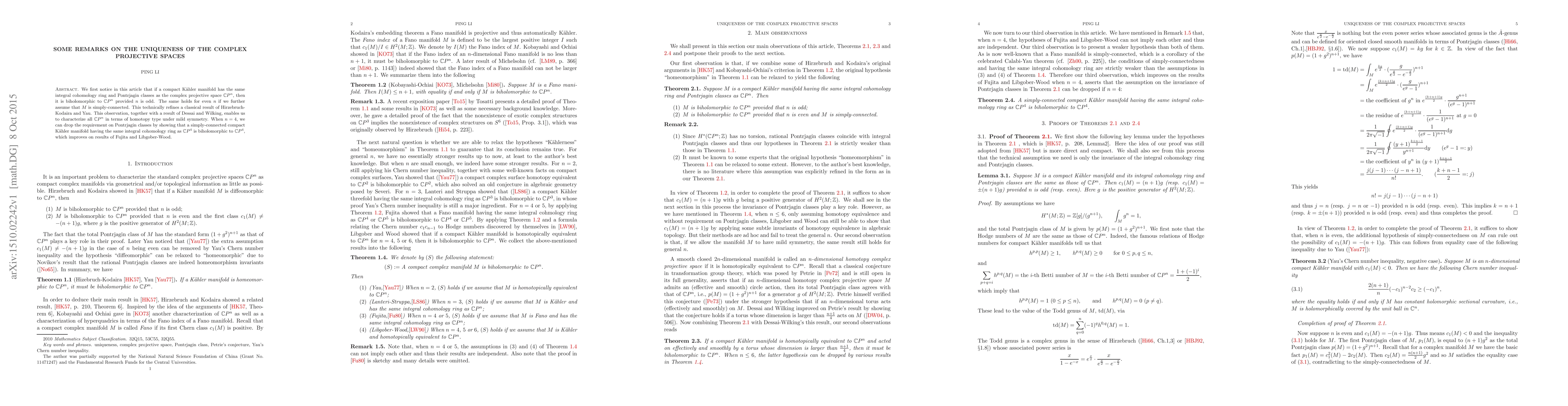We first notice in this article that if a compact K\"{a}hler manifold has the same integral cohomology ring and Pontrjagin classes as the complex projective space $\mathbb{C}P^n$, then it is biholomorphic to $\mathbb{C}P^n$ provided $n$ is odd. The same holds for even $n$ if we further assume that $M$ is simply-connected. This technically refines a classical result of Hirzebruch-Kodaira and Yau. This observation, together with a result of Dessai and Wilking, enables us to characterize all $\mathbb{C}P^n$ in terms of homotopy type under mild symmetry. When $n=4$, we can drop the requirement on Pontrjagin classes by showing that a simply-connected compact K\"{a}hler manifold having the same integral cohomology ring as $\mathbb{C}P^4$ is biholomorphic to $\mathbb{C}P^4$, which improves on results of Fujita and Libgober-Wood.