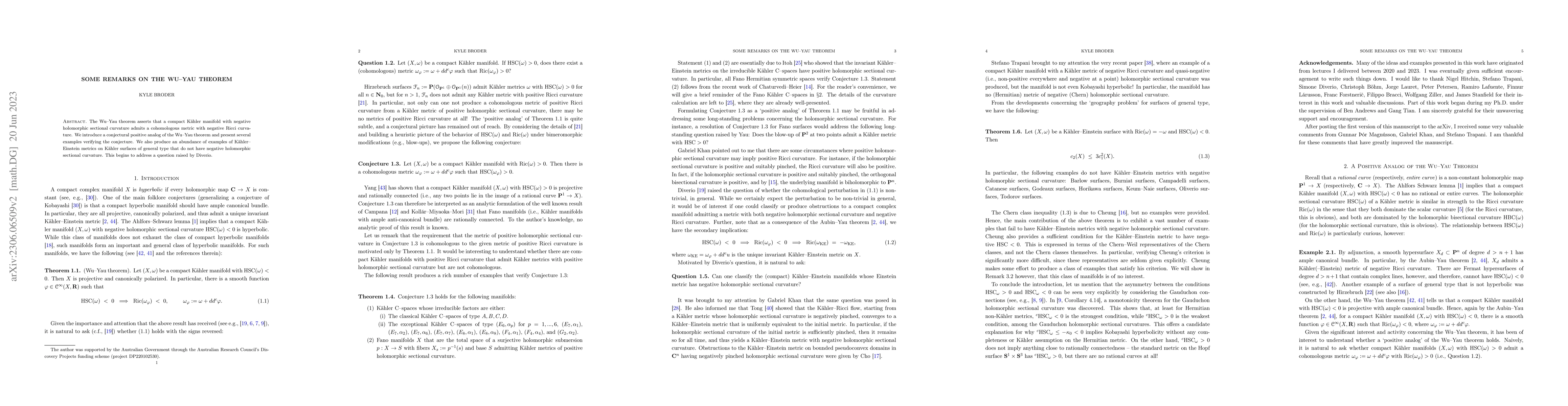 The Wu-Yau theorem posits that a compact Kähler manifold with negative holomorphic sectional curvature can be transformed to have negative Ricci curvature. The paper proposes a conjectured positive analog of this theorem and provides examples supporting it, while also illustrating Kähler-Einstein metrics on Kähler surfaces lacking negative holomorphic sectional curvature.
