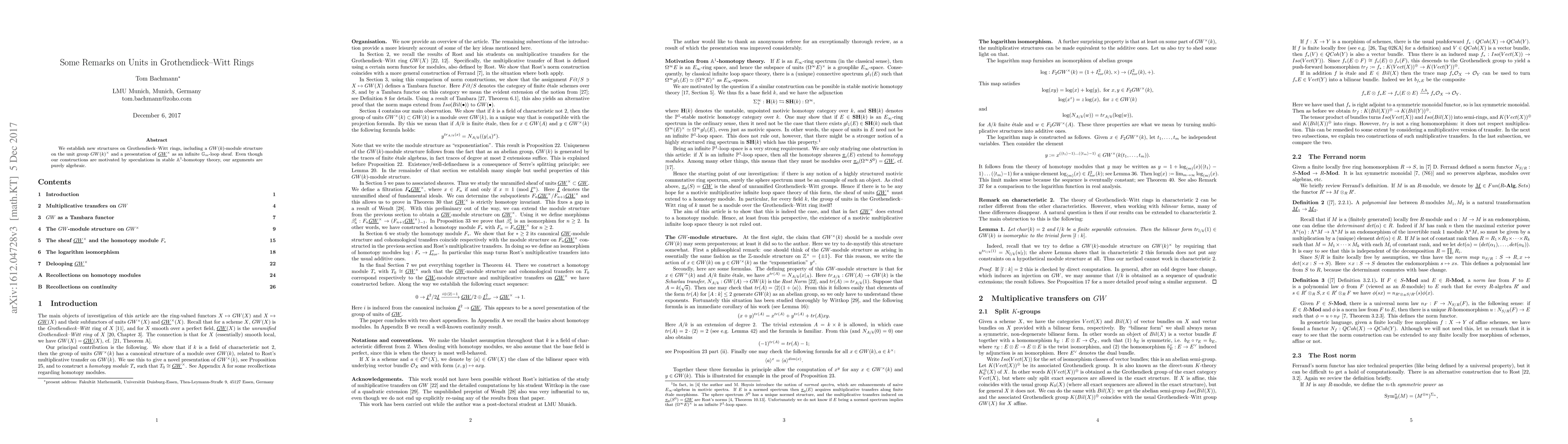 The paper introduces a GW(k)-module structure on the unit group GW(k)^x and presents \ul{GW}^x as an infinite Gm-loop sheaf, advancing the algebraic understanding of Grothendieck-Witt rings.