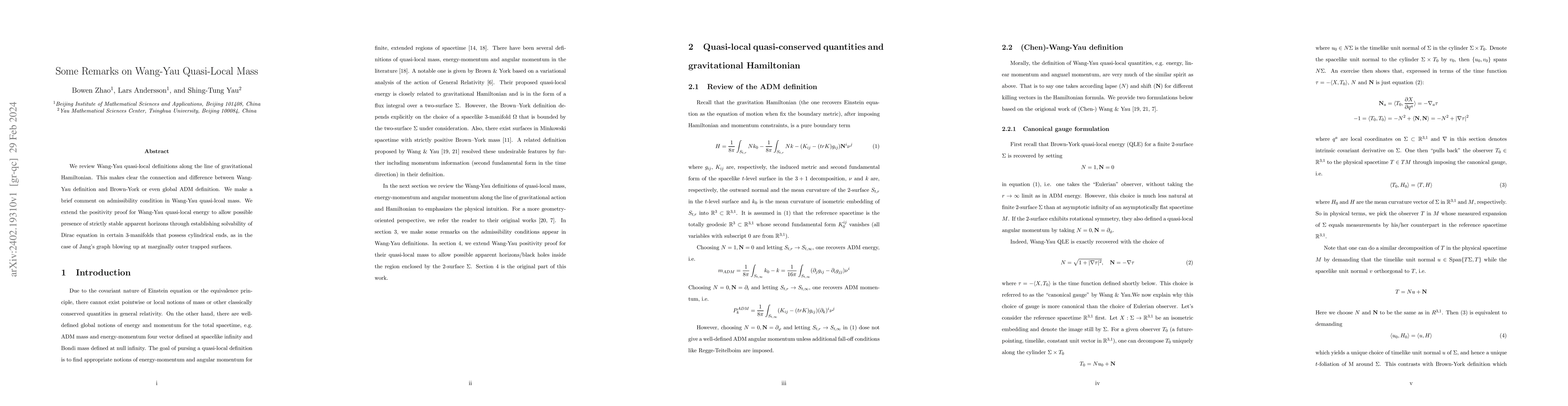 We review Wang-Yau quasi-local definitions along the line of gravitational Hamiltonian. This makes clear the connection and difference between Wang-Yau definition and Brown-York or even global ADM definition. We make a brief comment on admissibility condition in Wang-Yau quasi-lcoal mass. We extend the positivity proof for Wang-Yau quasi-local energy to allow possible presence of strictly stable apparent horizons through establishing solvability of Dirac equation in certain 3-manifolds that possess cylindrical ends, as in the case of Jang's graph blowing up at marginally outer trapped surfaces.