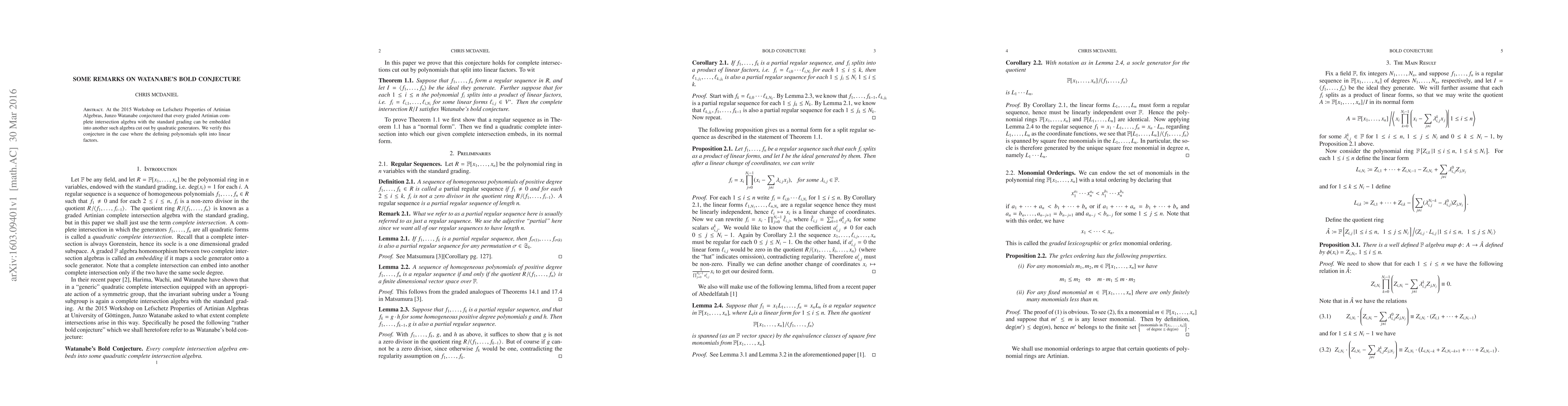 At the 2015 Workshop on Lefschetz Properties of Artinian Algebras, Junzo Watanabe conjectured that every graded Artinian complete intersection algebra with the standard grading can be embedded into another such algebra cut out by quadratic generators. We verify this conjecture in the case where the defining polynomials split into linear factors.