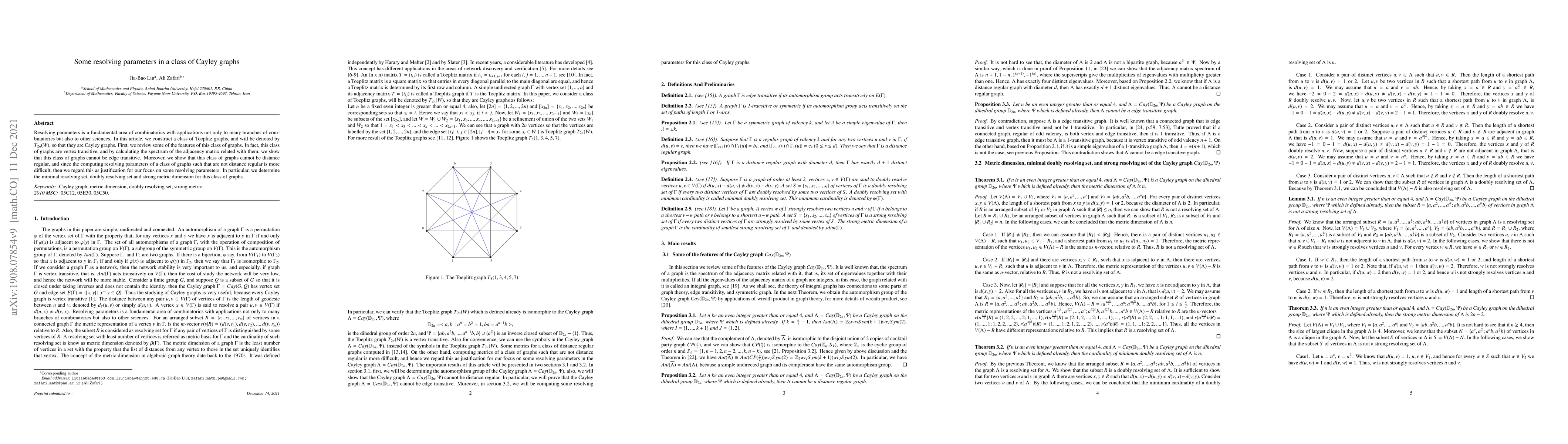 This paper constructs a class of Toeplitz Cayley graphs, denoted $T_{2n}(W)$, which are vertex transitive but neither edge transitive nor distance regular. The authors determine the minimal resolving set, doubly resolving set, and strong metric dimension for this class of graphs, highlighting the complexity of resolving parameters in non-distance regular graphs.