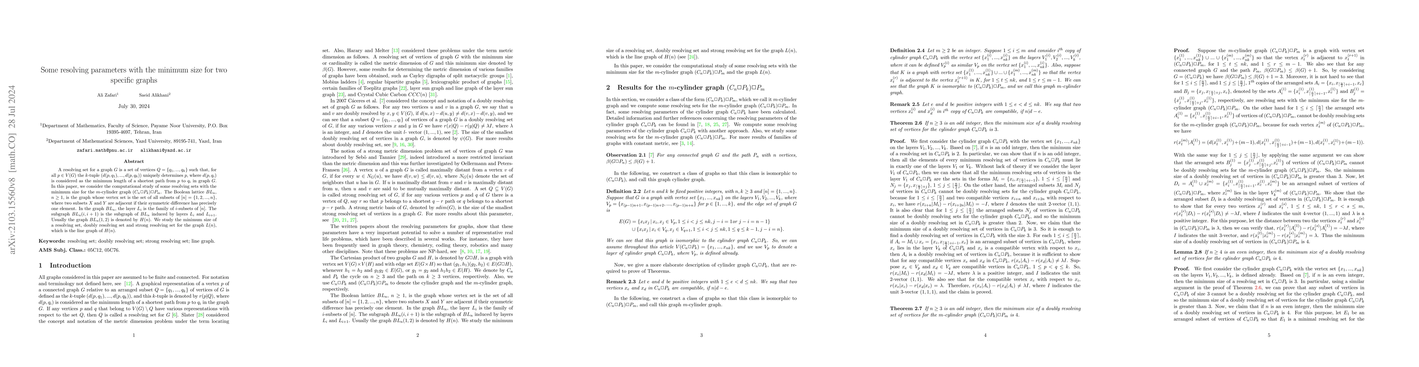 This paper investigates the minimum size of resolving sets for the Cartesian product $(C_n\Box P_k)\Box P_m$ and explores resolving parameters for the graph $H(n)$, including the minimum size of resolving, doubly resolving, and strong resolving sets for its line graph $L(n)$.