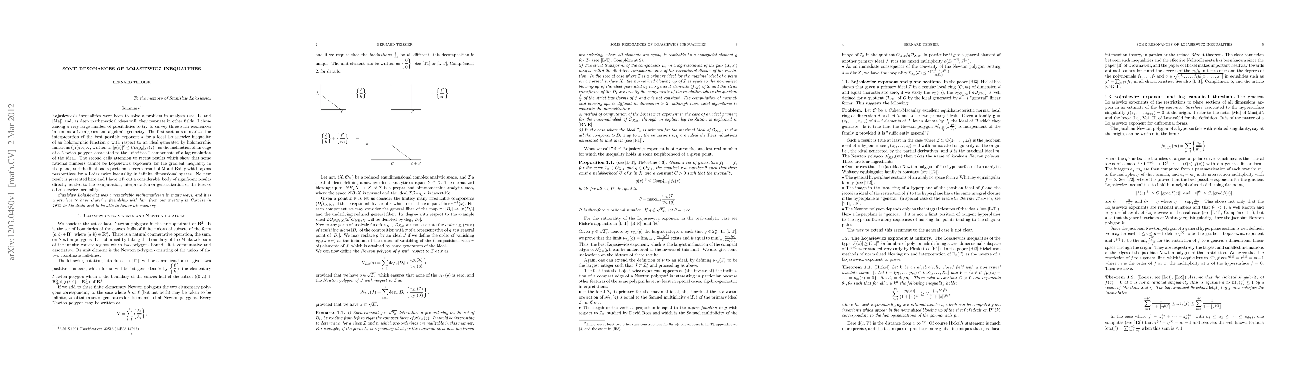 This note presents three resonances in commutative algebra and analytic geometry of the concept of Lojasiewicz inequality. The first is the interpretation in complex analytic geometry of the best possible exponent for a function g with respect to an ideal I at a point of a reduced complex space X as the inclination of a edge of a Newton polygon associated to the dicritical components of as log resolution of I. The second calls attention to recent results which show that some rational numbers connot be Lojasiewicz exponents for the gradient inequality of a holomorphic function of two variables. The last one reports on a recent result of Moret-Bailly which opens perspectives for a Lojasiewicz inequality in infinite dimensional spaces.