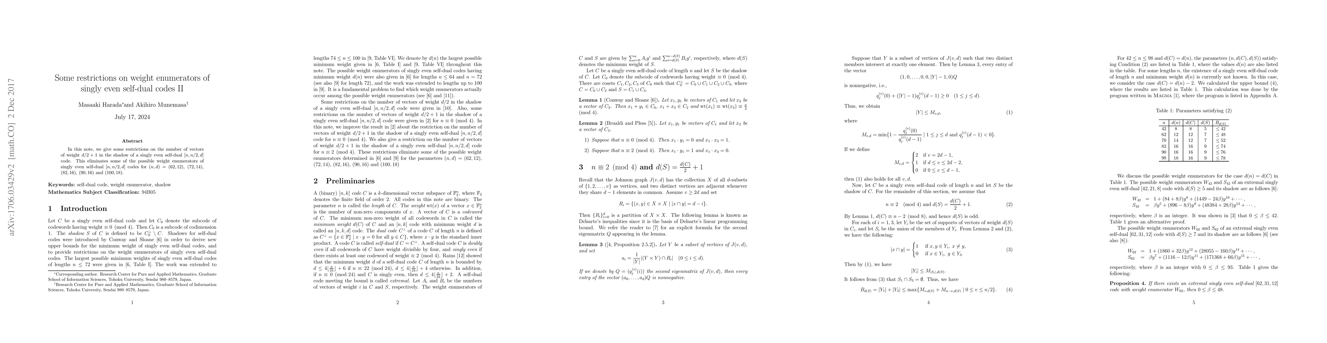 This paper establishes restrictions on the weight enumerators of singly even self-dual codes, specifically focusing on codes of certain dimensions and minimum distances. It eliminates some possible weight enumerators for specific code parameters.