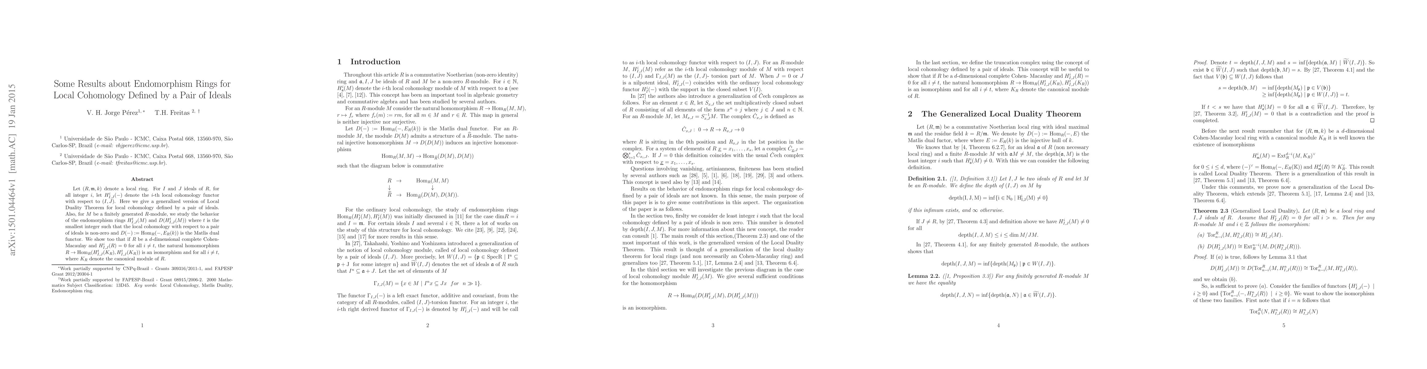 This paper generalizes the Local Duality Theorem for local cohomology defined by a pair of ideals in a local ring. It studies the endomorphism rings of local cohomology modules and their duals, proving that under certain conditions, the natural homomorphism from the ring to its endomorphism ring is an isomorphism.