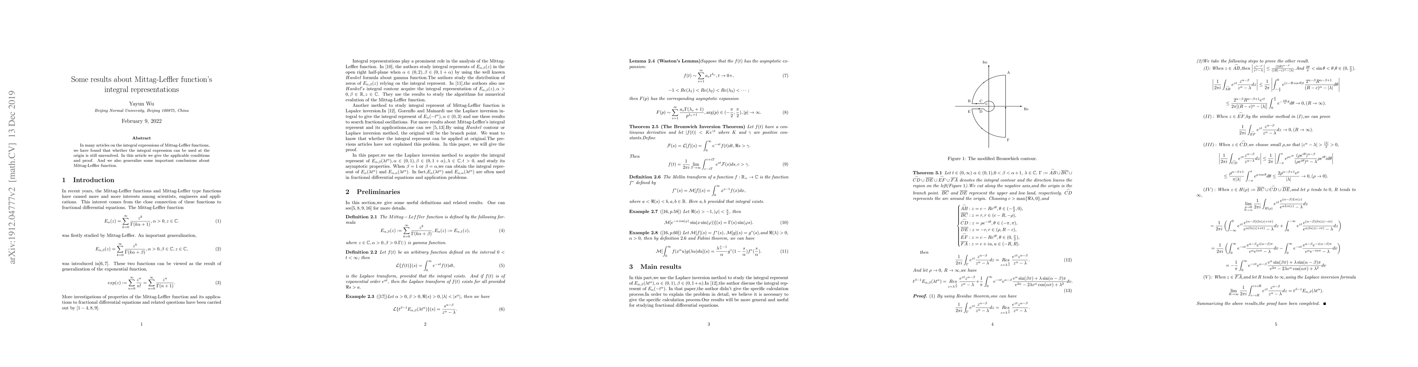 In many articles on the integral expressions of Mittag-Leffler functions, we have found that whether the integral expression can be used at the origin is still unresolved. In this article we give the applicable conditions and proof. And we also generalize some important conclusions about Mittag-Leffler function.