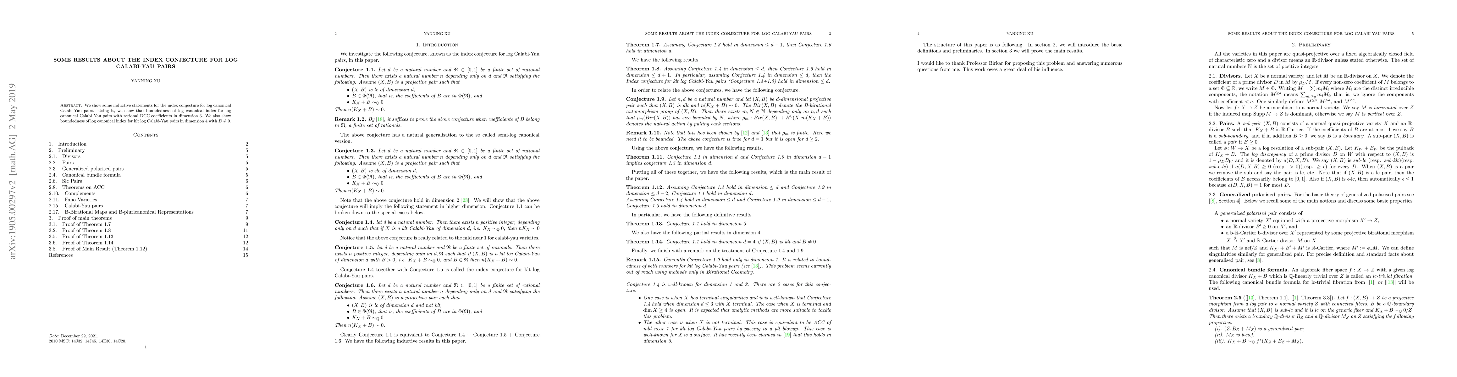 This paper proves inductive statements supporting the index conjecture for log canonical Calabi-Yau pairs, demonstrating boundedness of the log canonical index for such pairs in dimensions 3 and 4, particularly under rational DCC and non-zero boundary conditions.