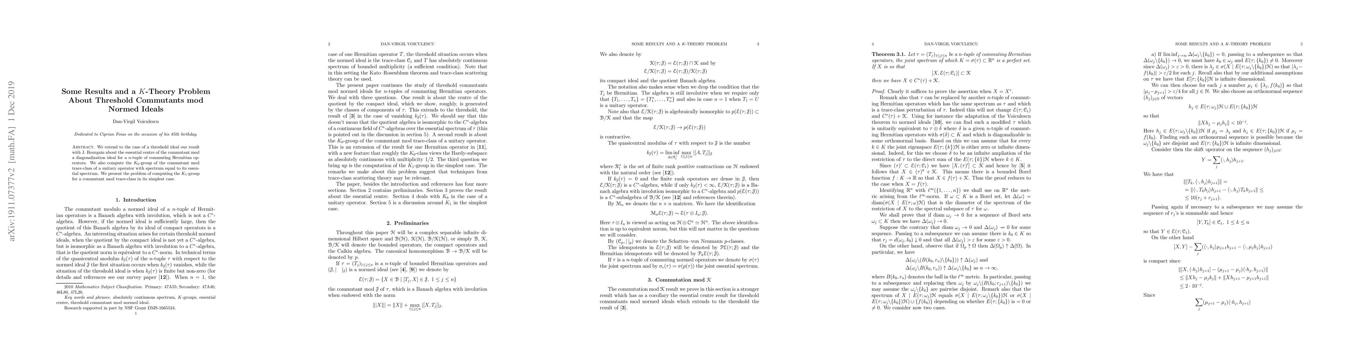 We extend to the case of a threshold ideal our result with J. Bourgain about the essential centre of the commutant mod a diagonalization ideal for a n-tuple of commuting Hermitian operators . We also compute the $K_0$-group of the commutant mod trace-class of a unitary operator with spectrum equal to its essential spectrum. We present the problem of computing the $K_1$-group for a commutant mod trace-class in its simplest case.