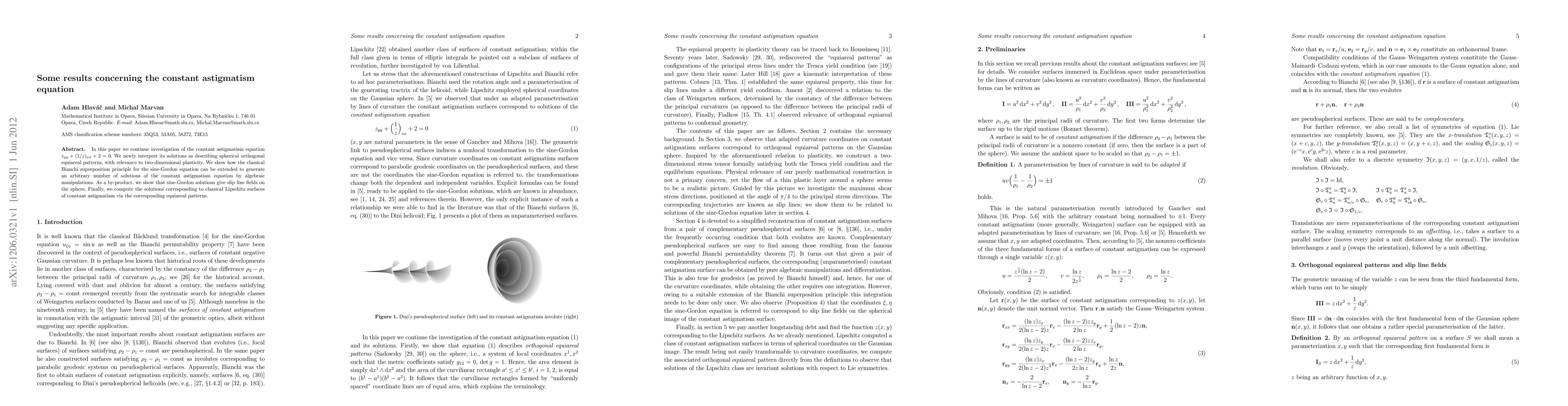 This paper investigates the constant astigmatism equation, interpreting its solutions as spherical orthogonal equiareal patterns relevant to two-dimensional plasticity. It extends the Bianchi superposition principle to generate multiple solutions through algebraic manipulations and links sine-Gordon solutions to slip line fields on the sphere.