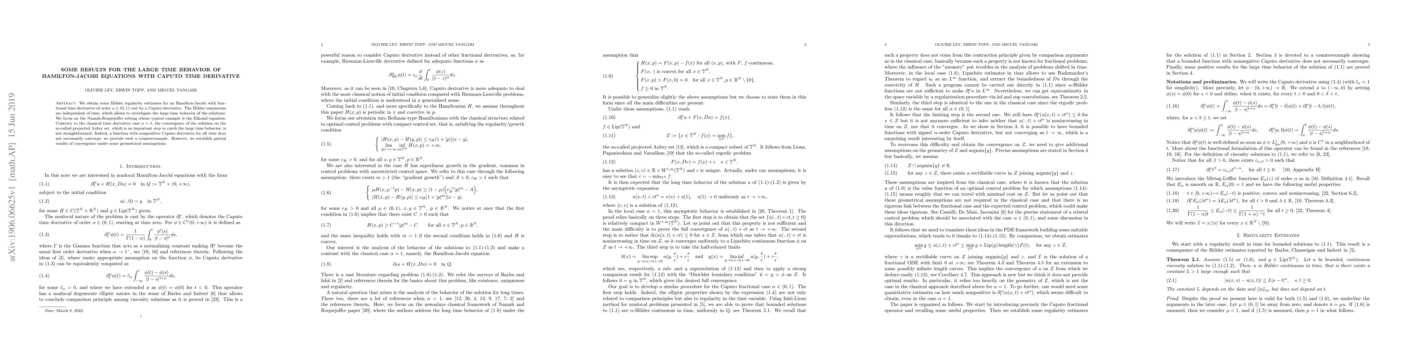 This paper investigates H\"older regularity estimates for Hamilton-Jacobi equations with Caputo fractional time derivatives. It demonstrates that H\"older seminorms are time-independent, allowing analysis of large time behavior, particularly in the Namah-Roquejoffre setting exemplified by the Eikonal equation. While convergence on the projected Aubry set is not guaranteed, partial convergence results are established under certain geometrical assumptions.