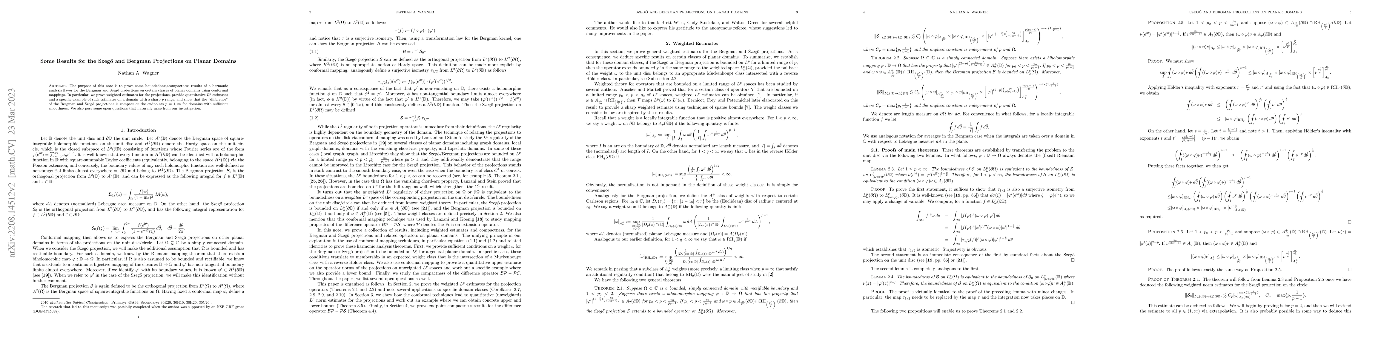 This paper proves boundedness and compactness results for Bergman and Szegő projections on planar domains using conformal mappings, including weighted estimates and $L^p$ estimates. It also demonstrates the compactness of the difference between these projections at $p = 1, \infty$ for sufficiently smooth domains.