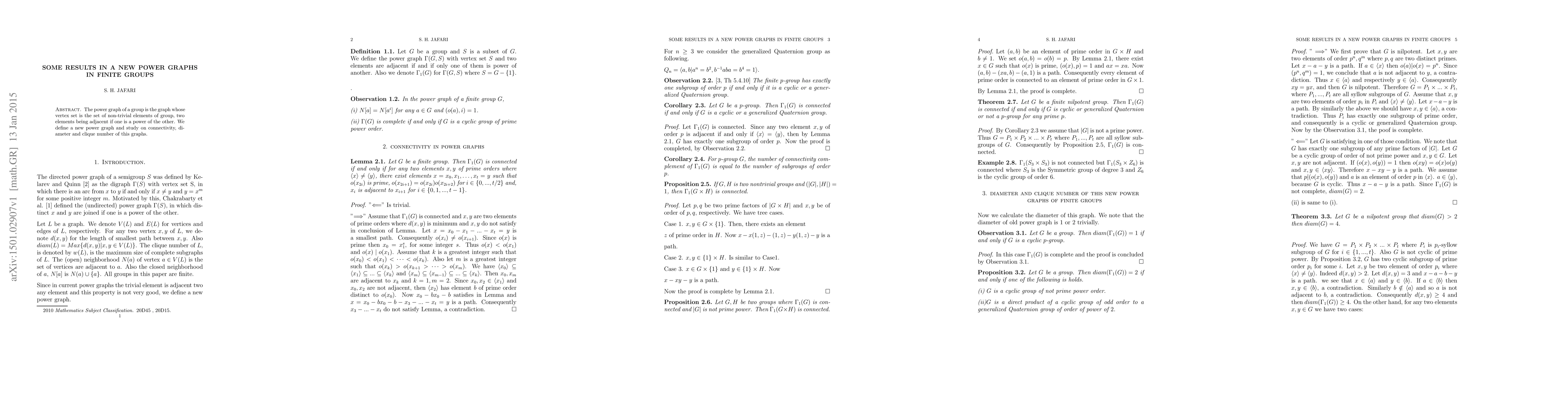 This paper studies a new type of graph called the power graph, which connects non-trivial group elements if one is a power of the other, exploring its connectivity, diameter, and clique number.