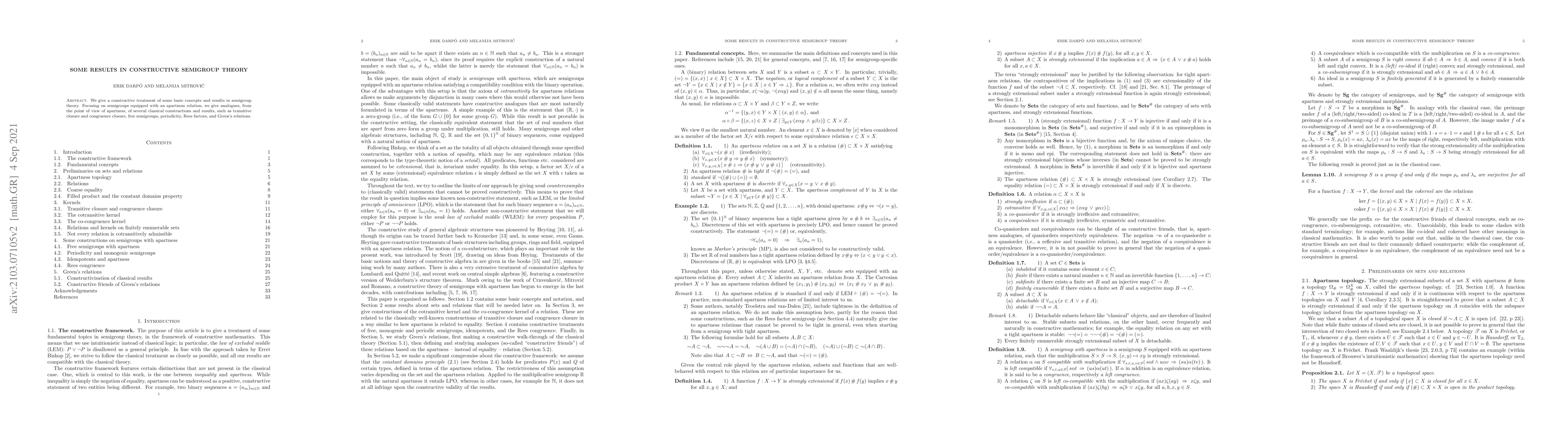 This paper provides a constructive approach to fundamental concepts in semigroup theory, particularly focusing on semigroups with an apartness relation, and presents analogues of classical constructions and results, including transitive closure, congruence closure, and Green's relations.