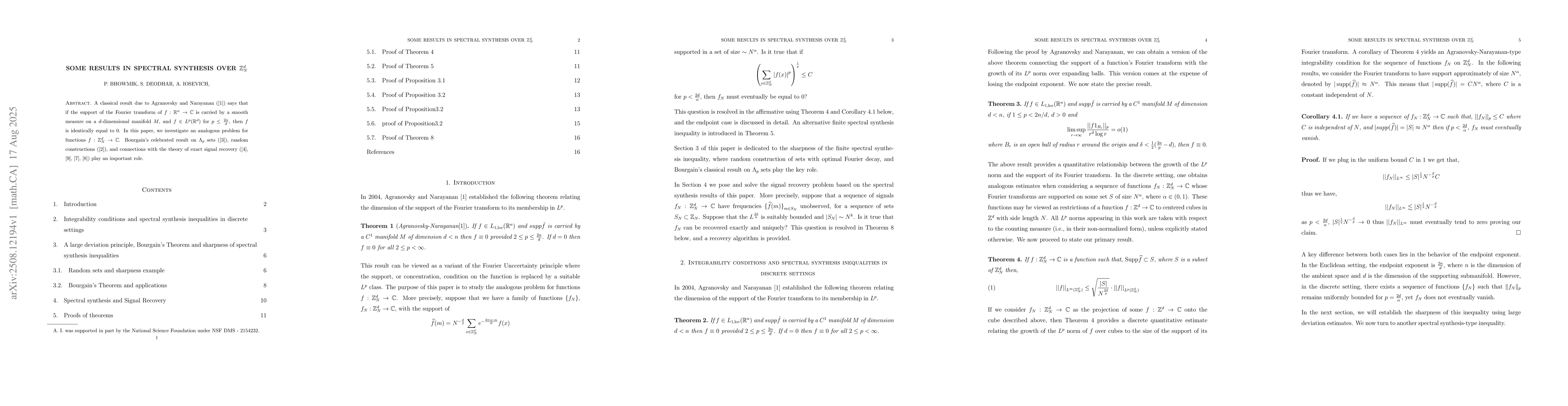 A classical result due to Agranovsky and Narayanan (\cite{AN04}) says that if the support of the Fourier transform of $f: {\mathbb R}^n \to {\mathbb C}$ is carried by a smooth measure on a $d$-dimensional manifold $M$, and $f \in L^p({\mathbb R}^d)$ for $p \leq \frac{2n}{d}$, then $f$ is identically equal to $0$. In this paper, we investigate an analogous problem for functions $f: {\mathbb Z}_N^d \to {\mathbb C}$. Bourgain's celebrated result on $\Lambda_p$ sets (\cite{Bou89}), random constructions (\cite{Bab89}), and connections with the theory of exact signal recovery (\cite{DS89}, \cite{MS73}, \cite{IKLM24}, \cite{IM24}) play an important role.