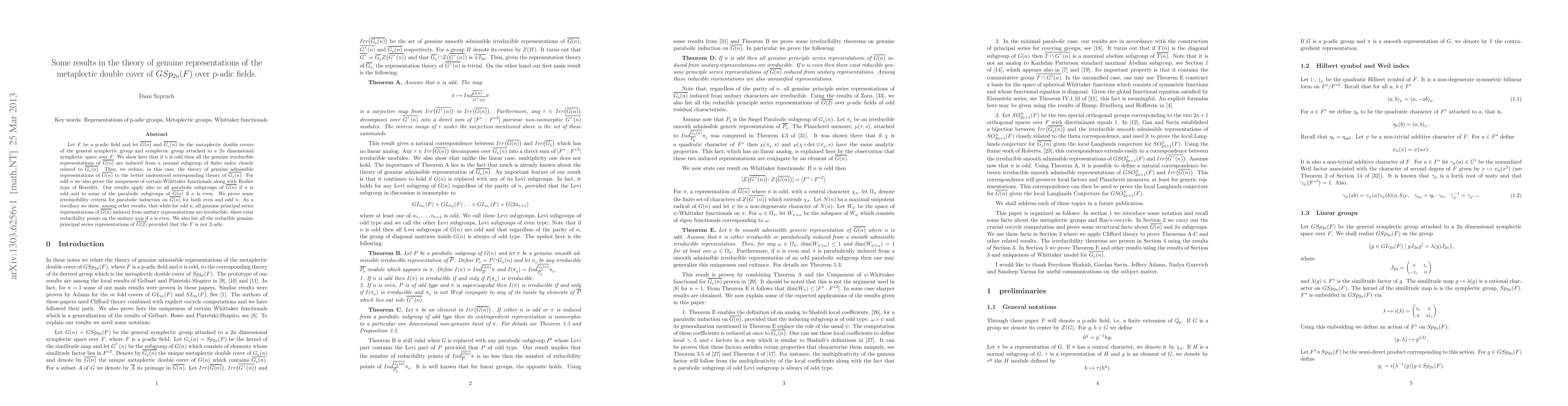 Let F be a p-adic field and let G(n) and G`(n) be the metaplectic double covers of the general symplectic group and symplectic group attached to a 2n dimensional symplectic space over F. We show here that if n is odd then all the genuine irreducible representations of G(n) are induced from a normal subgroup of finite index closely related to G`(n). Thus, we reduce, in this case, the theory of genuine admissible representations of G(n) to the better understood corresponding theory of G`(n). For odd n we also prove the uniqueness of certain Whittaker functionals along with Rodier type of Heredity. Our results apply also to all parabolic subgroups of G(n) if n is odd and to some of the parabolic subgroups of G(n) if n is even. We prove some irreducibility criteria for parabolic induction on G(n) for both even and odd n. As a corollary we show, among other results, that while for odd n, all genuine principal series representations of G(n) induced from unitary representations are irreducible, there exist reducibility points on the unitary axis if n is even. We also list all the reducible genuine principal series representations of G(2) provided that the F is not 2-adic.