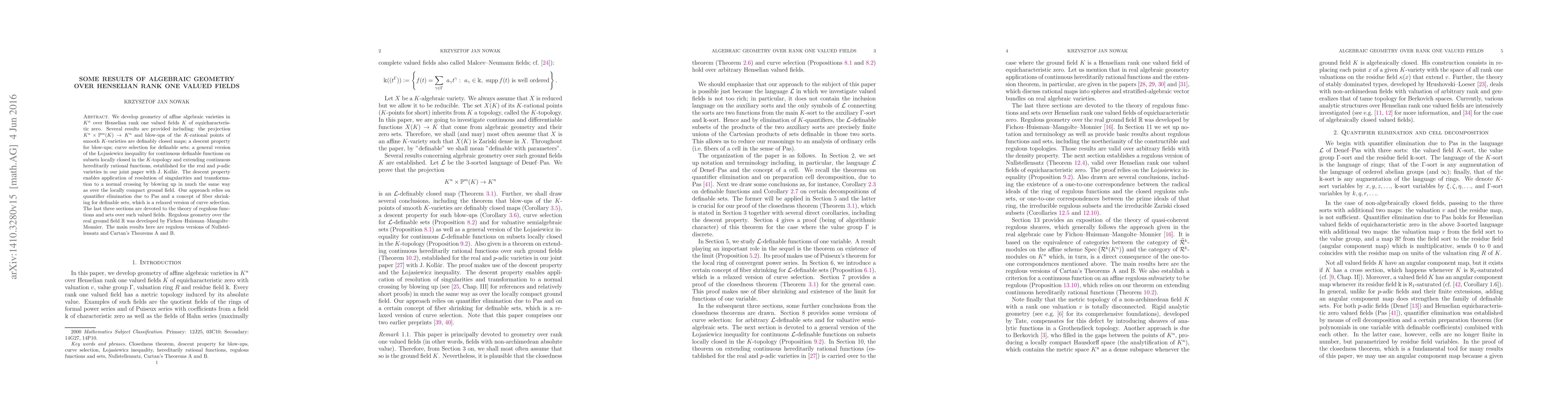 This paper develops algebraic geometry over Henselian rank one valued fields, proving several results including definably closed maps for projections and blow-ups, and establishing a general \L{}ojasiewicz inequality. The authors also introduce regulous functions and sets, proving regulous versions of Nullstellensatz and Cartan's Theorems A and B.