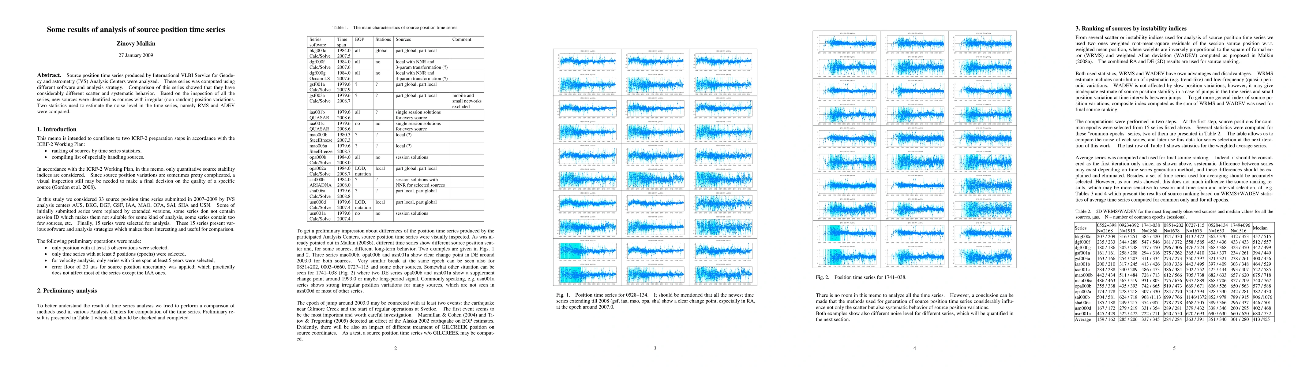 This paper analyzes source position time series from IVS Analysis Centers, revealing significant differences in scatter and systematic behavior across series computed with different software and strategies. The study identifies new sources with irregular position variations and compares RMS and ADEV statistics to assess noise levels in the time series.