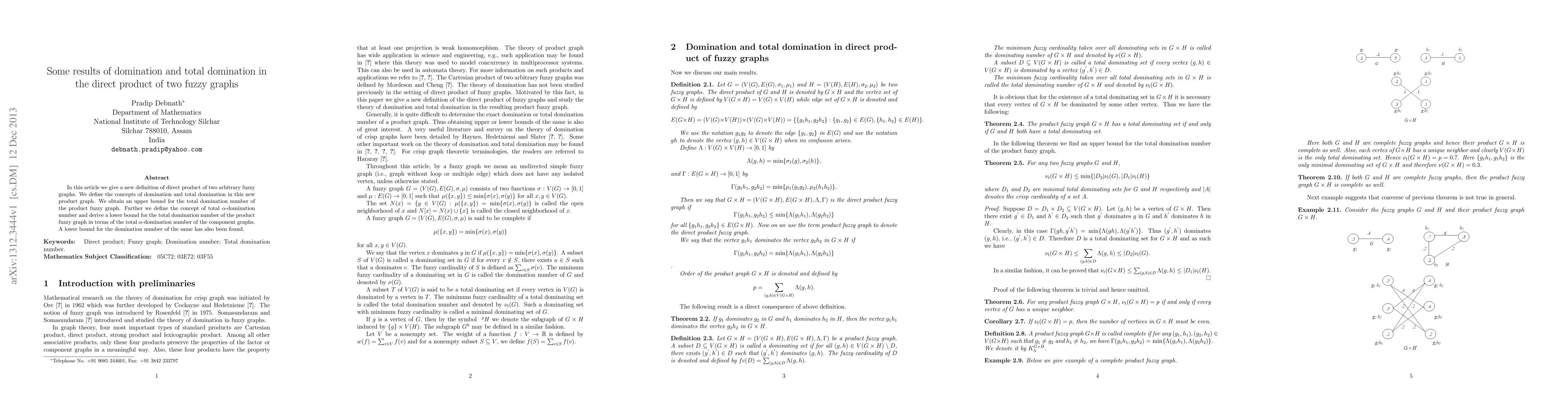 This paper introduces a new definition for the direct product of two fuzzy graphs and defines domination and total domination within this product. It establishes an upper bound for the total domination number and derives lower bounds for both the total domination number and the domination number in terms of the total alpha-domination number of the component graphs.