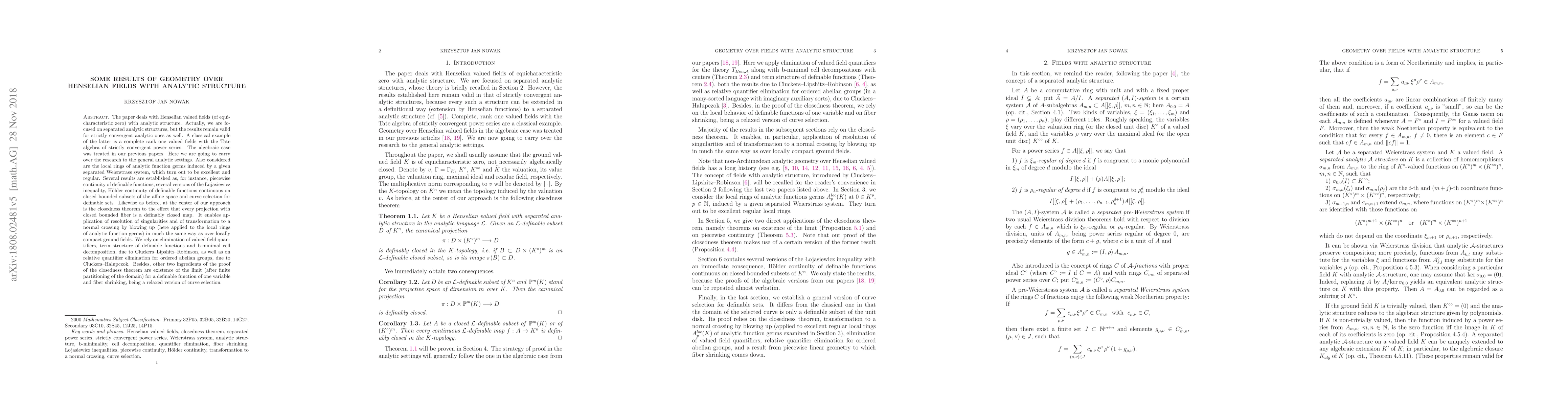This paper explores geometry over Henselian fields with analytic structure, focusing on separated analytic structures and their applications. It establishes several results, including piecewise continuity of definable functions and versions of the \L{}ojasiewicz inequality, leveraging techniques like resolution of singularities and b-minimal cell decomposition.